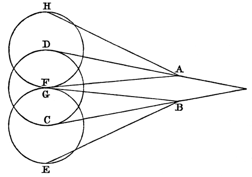 [Pg 12] “When one object is seen with two eyes, the angles at the vertices of the optical pyramids (namely, haf, gbe, Fig. 1) are not always equal, for beside the direct view in which the pyramids ought to be equal, into whatever direction both eyes are turned, they receive pictures of the object under inequal angles, the greatest of which is that which is terminated at the nearer eye, and the lesser that which regards the remoter eye. This, I think, is perfectly evident; but I consider it as worthy of admiration, how it happens that bodies seen by both eyes are not all confused and shapeless, though we view them by the optical axes fixed on the bodies themselves. For greater bodies, seen under greater angles, appear lesser bodies under lesser angles. If, therefore, one and the same body which is in reality greater with one eye, is seen less on account of the inequality of the angles in which the pyramids are terminated, (namely, haf, gbe,[8]) the body itself must assuredly be seen greater or less at the same time, and to the same person that views it; and, therefore, since the images in each eye are dissimilar (minime sibi congruunt) the representation of the object must appear confused and disturbed (confusa ac perturbata) to the primary sense.”
