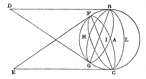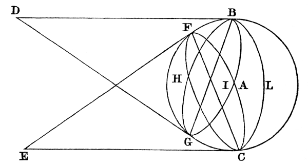 In his fourth and very interesting book, on the fallacies of distance, magnitude, position, and figure, Aguilonius resumes the subject of the vision of solid bodies. He repeats the theorems of Euclid and Gassendi on the vision of the sphere, shewing how much of it is seen by each eye, and by both, whatever be the size of the sphere, and the distance of the observer. At the end of the theorems, in which he demonstrates that when the diameter of the sphere is equal to the distance between the eyes we see exactly a hemisphere, he gives the annexed drawing of the mode in which the sphere is seen by each eye, and by both. In this diagram e is the right eye and d the left, chfi the section of that part of the sphere bc which is seen by the right eye e, bhga the section of the part which is seen by the left eye d, and blc the [Pg 15] half of the great circle which is the section of the sphere as seen by both eyes.[10] These three pictures of the solids are all dissimilar. The right eye e does not see the part blcif of the sphere; the left eye does not see the part blcga, while the part seen with both eyes is the hemisphere blcgf, the dissimilar segments bfg, cgf being united in its vision.[11]