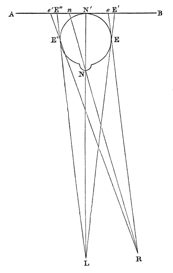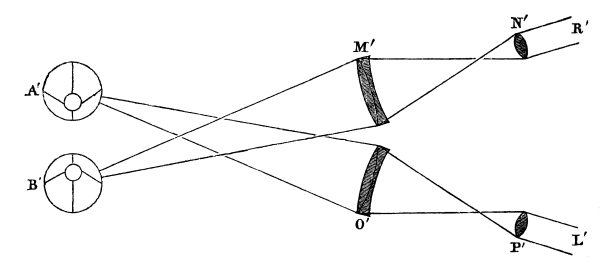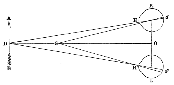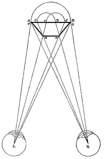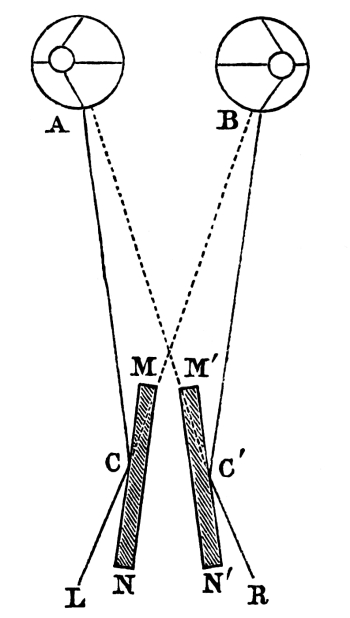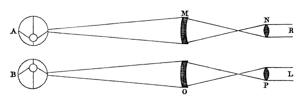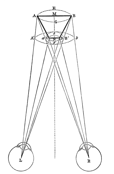 In this passage the author makes a distinction between ordinary binocular vision, and binocular vision through the stereoscope, whereas in reality there is none. The theory of both is exactly the same. The muscles of the two eyes unite the two dissimilar pictures, and exhibit the solid, in ordinary vision; whereas in stereoscopic vision the images are united by reflexion or refraction, the eyes in both cases obtaining the vision of different distances by rapid and successive convergences of the optical axes. Mr. Wheatstone notices the degree of indistinctness in the parts of the picture to which the eyes are not immediately directed; but he does not notice the [Pg 25] “confusion and incongruity” which Aguilonius says ought to exist, in consequence of some parts of the resulting relievo being seen of one size by the left eye alone,—other parts of a different size by the right eye alone, and other parts by both eyes. This confusion, however, Aguilonius, as we have seen, found not to exist, and he ascribes it to the influence of a common sense overruling the operation of physical laws. Erroneous as this explanation is, it is still better than that of Mr. Wheatstone, which we shall now proceed to explain.
