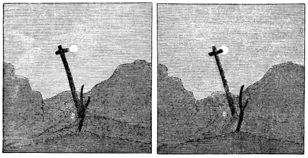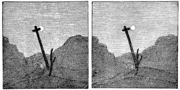 Mr. Elliot was led to the study of binocular vision in consequence of having written an Essay, so early as 1823, for the Class of Logic in the University of Edinburgh, “On the means by which we obtain our knowledge of distances by the Eye.” Ever since that date he was familiar with the idea, that the relief of solid bodies seen by the eye [Pg 19] was produced by the union of the dissimilar pictures of them in each eye, but he never imagined that this idea was his own, believing that it was known to every student of vision. Previous to or during the year 1834, he had resolved to construct an instrument for uniting two dissimilar pictures, or of constructing a stereoscope; but he delayed doing this till the year 1839, when he was requested to prepare an original communication for the Polytechnic Society, which had been recently established in Liverpool. He was thus induced to construct the instrument which he had projected, and he exhibited it to his friends, Mr. Richard Adie, optician, and Mr. George Hamilton, lecturer on chemistry in Liverpool, who bear testimony to its existence at that date. This simple stereoscope, without lenses or mirrors, consisted of a wooden box 18 inches long, 7 broad, and 4½ deep, and at the bottom of it, or rather its farther end, was placed a slide containing two dissimilar pictures of a landscape as seen by each eye. Photography did not then exist, to enable Mr. Elliot to procure two views of the same scene, as seen by each eye, but he drew the transparency of a landscape with three distances. The first and most remote was the moon and the sky, and a stream of water from which the moon was reflected, the two moons being placed nearly at the distance of the two eyes, or 2½ inches, and the two reflected moons at the same distance. The second distance was marked by an old cross about a hundred feet off; and the third distance by the withered branch of a tree, thirty feet from the observer. In the right-hand picture, one arm of the cross just touched the disc of the moon, while, in the left-hand one, it projected over one-third of the disc. The branch of the tree [Pg 20] touched the outline of a distant hill in the one picture, but was “a full moon’s-breadth” from it on the other. When these dissimilar pictures were united by the eyes, a landscape, certainly a very imperfect one, was seen in relief, composed of three distances.