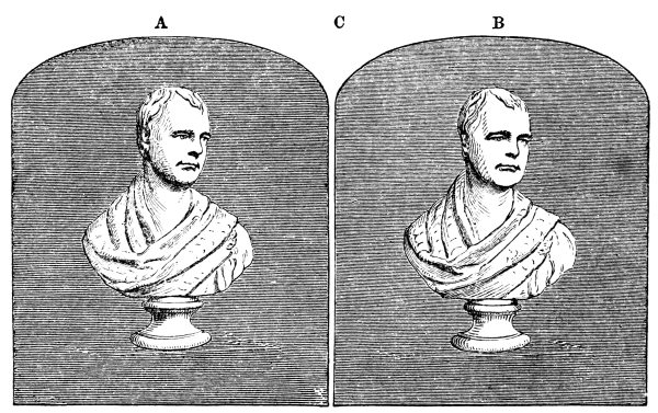 When the artist represents living objects, or groups of them, and [Pg 2] delineates buildings or landscapes, or when he copies from statues or models, he produces apparent solidity, and difference of distance from the eye, by light and shade, by the diminished size of known objects as regulated by the principles of geometrical perspective, and by those variations in distinctness and colour which constitute what has been called aerial perspective. But when all these appliances have been used in the most skilful manner, and art has exhausted its powers, we seldom, if ever, mistake the plane picture for the solid which it represents. The two eyes scan its surface, and by their distance-giving power indicate to the observer that every point of the picture is nearly at the same distance from his eye. But if the observer closes one eye, and thus deprives himself of the power of determining differences of distance by the convergency of the optical axes, the relief of the picture is increased. When the pictures are truthful photographs, in which the variations of light and shade are perfectly represented, a very considerable degree of relief and solidity is thus obtained; and when we have practised for a while this species of monocular vision, the drawing, whether it be of a statue, a living figure, or a building, will appear to rise in its different parts from the canvas, though only to a limited extent.