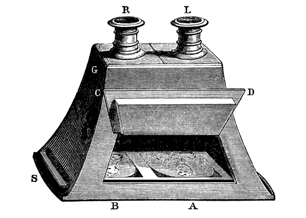 The Stereoscope, a word derived from στέρεος, solid, and σκόπειν, to see, is an optical instrument, of modern invention, for representing, in apparent relief and solidity, all natural objects and all groups or combinations of objects, by uniting into one image two plane representations of these objects or groups as seen by each eye separately. In its most general form the Stereoscope is a binocular instrument, that is, is applied to both eyes; but in two of its forms it is monocular, or applied only to one eye, though the use of the other eye, without any instrumental aid, is necessary in the combination of the two plane pictures, or of one plane picture and its reflected image. The Stereoscope, therefore, cannot, like the telescope and microscope, be used by persons who have lost the use of one eye, and its remarkable effects cannot be properly appreciated by those whose eyes are not equally good.