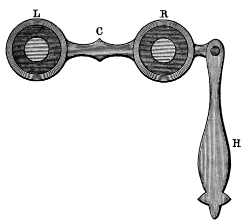 In this experiment with the book, and in all cases where the object is near the eye, we not only see different pictures of the same object, but we see different things with each eye. Those who wear spectacles see only the left-hand spectacle-glass with the left eye, on the left side of the face, while with the right eye they see only the right-hand spectacle-glass on the right side of the face, both [Pg 6] glasses of the spectacles being seen united midway between the eyes, or above the nose, when both eyes are open. It is, therefore, a fact well known to every person of common sagacity that the pictures of bodies seen by both eyes are formed by the union of two dissimilar pictures formed by each.