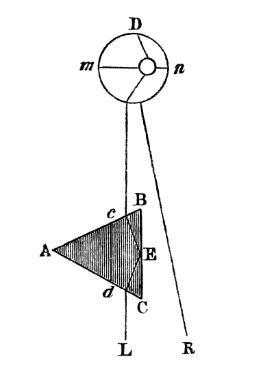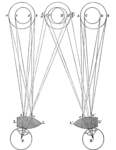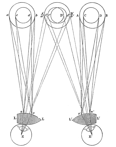 Such was the state of our stereoscopic knowledge in 1838, after the publication of Mr. Wheatstone’s interesting and important paper. Previous to this I communicated to the British Association at Newcastle, in August 1838, a paper, in which I established the law of visible direction already mentioned, which, though it had been maintained by preceding writers, had been proved by the illustrious D’Alembert to be incompatible with observation, and the admitted anatomy of the human eye. At the same meeting Mr. Wheatstone exhibited his stereoscopic apparatus, which gave rise to an animated discussion on the theory of the instrument. Dr. Whewell maintained that the retina, in uniting, or causing to coalesce into a single resultant impression two lines of different lengths, had the power either of contracting the longest, or lengthening the shortest, or what might have been suggested in order to give the retina only half the trouble, that it contracted the long line as much as it expanded the short one, and thus caused them to combine with a less exertion of muscular power! In opposition to these views, I maintained that the retina, a soft pulpy membrane which the smallest force tears in pieces, had no such power,—that a hypothesis so gratuitous was not required, and that the law of visible direction afforded the most perfect explanation of all the stereoscopic phenomena.