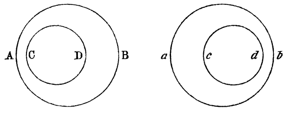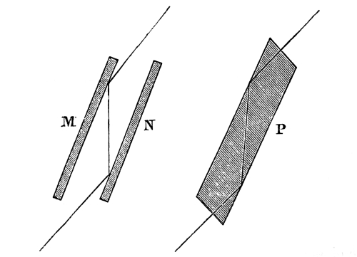 After describing his apparatus, Mr. Wheatstone proceeds to consider (in a section entitled, “Binocular vision of objects of different magnitudes”) “what effects will result from presenting similar images, differing only in magnitude, to analogous parts of the retina.” “For this purpose,” he says, “two squares or circles, differing obviously but not extravagantly in size, may be drawn on two separate pieces of paper, and placed in the stereoscope, so that the reflected image of each shall be equally distant from the eye by which it is regarded. It will then be seen that notwithstanding this difference they coalesce and occasion a single resultant perception.” The fact of coalescence being supposed to be perfect, the author next seeks to determine the difference between the length of two lines which the eye can force into coalescence, or “the limits within which the single appearance subsists.” He, therefore, unites two images of equal magnitude, by making one of them visually less from distance, and he states that, “by this experiment, the single appearance of two images of different size is demonstrated.” Not satisfied with these erroneous assertions, he proceeds to give a sort of rule or law for ascertaining the relative size of the two unequal pictures which the eyes can force into coincidence. The inequality, he concludes, must not exceed the difference “between the projections of the same object when seen in the most oblique position of the eyes [Pg 23] (i.e., both turned to the extreme right or the extreme left) ordinarily employed.” Now, this rule, taken in the sense in which it is meant, is simply a truism. It merely states that the difference of the pictures which the eyes can make to coalesce is equal to the difference of the pictures which the eyes do make to coalesce in their most oblique position; but though a truism it is not a truth, first, because no real coincidence ever can take place, and, secondly, because no apparent coincidence is effected when the difference of the picture is greater than what is above stated.