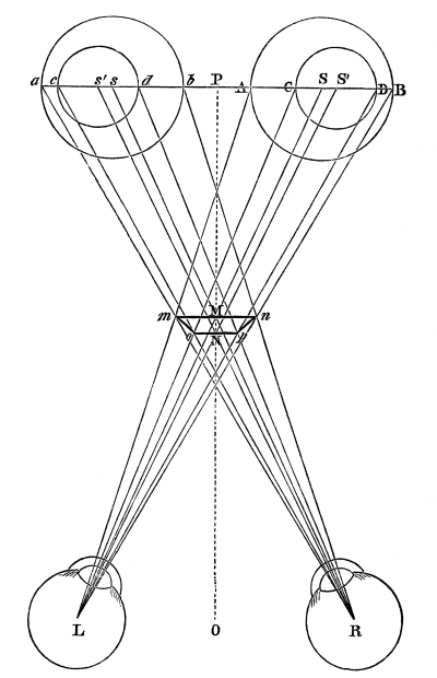 Such is Aguilonius’s theory of binocular vision, and of the union of the two dissimilar pictures in each eye by which a solid body is seen. It is obviously more correct than that of Dr. Whewell and Mr. Wheatstone. Aguilonius affirms it to be contrary to reason that two dissimilar pictures can be united into a clear and distinct picture, as they are actually found to be, and he is therefore driven to call in the aid of what does not exist, a common sense, which rectifies the picture. Dr. Whewell and Mr. Wheatstone have cut the Gordian knot by maintaining what is impossible, that in binocular and stereoscopic [Pg 14] vision a long line is made to coincide with a short one, and a large surface with a small one; and in place of conceiving this to be done by a common sense overruling optical laws, as Aguilonius supposes, they give to the tender and pulpy retina, the recipient of ocular pictures, the strange power of contracting or expanding itself in order to equalize inequal lines and inequal surfaces!