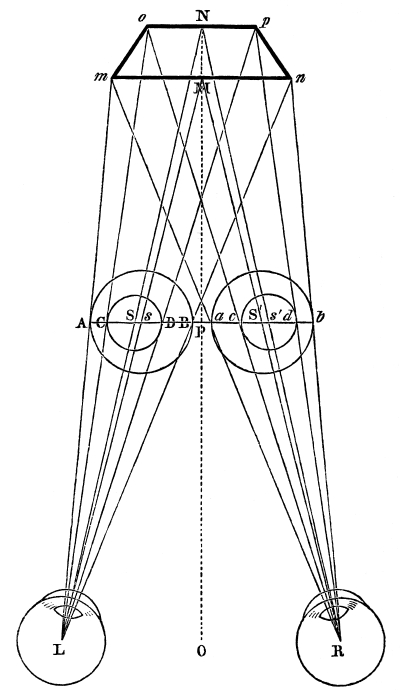 “This view of the subject,” he continues, “is certainly consistent with reason, but, what is truly wonderful is, that it is not correct, for bodies are seen clearly and distinctly with both eyes when the optic axes are converged upon them. The reason of this, I think, is, that the bodies do not appear to be single, because the apparent images, which are formed from each of them in separate eyes, exactly coalesce, [Pg 13] (sibi mutuo exacte congruunt,) but because the common sense imparts its aid equally to each eye, exerting its own power equally in the same manner as the eyes are converged by means of their optical axes. Whatever body, therefore, each eye sees with the eyes conjoined, the common sense makes a single notion, not composed of the two which belong to each eye, but belonging and accommodated to the imaginative faculty to which it (the common sense) assigns it. Though, therefore, the angles of the optical pyramids which proceed from the same object to the two eyes, viewing it obliquely, are inequal, and though the object appears greater to one eye and less to the other, yet the same difference does not pass into the primary sense if the vision is made only by the axes, as we have said, but if the axes are converged on this side or on the other side of the body, the image of the same body will be seen double, as we shall shew in Book iv., on the fallacies of vision, and the one image will appear greater and the other less on account of the inequality of the angles under which they are seen.”[9]