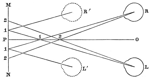 Now, in both these cases of over and under displacement, many persons have such a power over their optical axes, that by converging them to a point nearer than the picture, they would, in the first case, bring them back to their place of union, and by converging them to a point more remote than the picture, would, in the second case, bring them up to their place of [Pg 234] union; but others are very defective in this power of convergence, some having a facility of converging them beyond the pictures, and others between the pictures and the eye. This last, however, namely, that of near convergence, is by far the most common, especially among men; but it is of no avail, and the exercise of it is injurious when the under refracted pictures have not come up to their place of union. The power of remote convergence, which is very rare, and which would assist in bringing back the over refracted pictures to their place of union, is of no avail, and the exercise of it is injurious when the pictures have been too much displaced, and made to pass beyond their place of union.