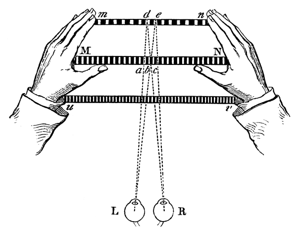 In the different passages which we have quoted from Mr. Wheatstone’s paper, and in the other parts of it which relate to binocular vision, he is obviously halting between truth and error, between theories which he partly believes, and ill-observed facts which he cannot reconcile with them. According to him, certain truths “may be supposed” to be true, and other truths may be “in some degree true,” but “not entirely so;” and thus, as he confesses, the problem of binocular and stereoscopic vision “is indeed one of great complexity,” of which “he will not attempt at present to give the complete solution.” If he had placed a proper reliance on the law of visible direction which he acknowledges I have established, and “with which,” he says, “the laws of visible direction for binocular vision ought to contain nothing inconsistent,” he would have seen the impossibility of the two eyes uniting two lines of inequal length; and had he believed in the law of distinct vision he would have seen the impossibility of the two eyes obtaining single vision of any more than one point of an object at a time. These laws of vision are as rigorously true as any other physical laws,—as completely demonstrated as the law of gravity in Astronomy, or the law of the Sines in Optics; and the moment we allow them to be tampered with to obtain an explanation of physical puzzles, we convert science into legerdemain, and philosophers into conjurors. [Pg 27]