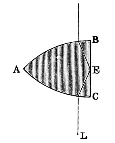 After demonstrating his theorems on the vision of spheres with one and both eyes,[12] Aguilonius informs us, before he proceeds to the vision of cylinders, that it is agreed upon that it is not merely true with the sphere, but also with the cylinder, the cone, and all bodies whatever, that the part which is seen is comprehended by tangent rays, such as eb, ec for the right eye, in Fig. 3. “For,” says he, “since these tangent lines are the outermost of all those which can be drawn to the proposed body from the same point, namely, that in which the eye is understood to be placed, it clearly follows that the part of the body which is seen must be contained by the rays touching it on all sides. For in this part no point can be found from which a right line cannot be drawn to the eye, by which the correct visible form is brought out.”[13]
