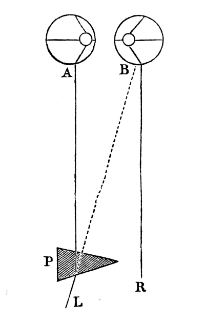 The subject of binocular vision was successfully studied by Francis Aguillon or Aguilonius,[6] a learned Jesuit, who published his Optics in 1613. In the first book of his work, where he is treating of the vision of solids of all forms, (de genere illorum quæ τὰ στέρεα [ta sterea] nuncupantur,) he has some difficulty in explaining, and fails to do it, why the two dissimilar pictures of a solid, seen by each eye, do not, when united, give a confused and imperfect view of it. This discussion is appended to the demonstration of the theorem, “that when an object is seen with two eyes, two optical pyramids are formed whose common base is the object itself, and whose vertices are in the eyes,”[7] and is as follows:—
