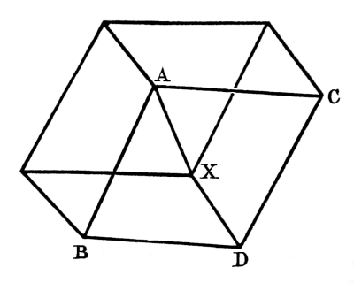 A very remarkable illusion, affecting the apparent position of the drawings of geometrical solids, was first observed by the late Professor Neckar, of Geneva, who communicated it to me personally in 1832.[73] “The rhomboid AX,” (Fig. 51,) he says, “is drawn so that the solid angle A should be seen nearest to the spectator, and the solid angle X the farthest from him, and that the face ACBD should be the foremost, while the face [Pg 229] XDC is behind. But in looking repeatedly at the same figure, you will perceive that at times the apparent position of the rhomboid is so changed that the solid angle X will appear the nearest, and the solid angle A the farthest, and that the face ACDB will recede behind the face XDC, which will come forward,—which effect gives to the whole solid a quite contrary apparent inclination.” Professor Neckar observed this change “as well with one as with both eyes,” and he considered it as owing “to an involuntary change in the adjustment of the eye for obtaining distinct vision. And that whenever the point of distinct vision on the retina was directed to the angle A for instance, this angle, seen more distinctly than the other, was naturally supposed to be nearer and foremost, while the other angles, seen indistinctly, were supposed to be farther away and behind. The reverse took place when the point of distinct vision was brought to bear upon the angle X. What I have said of the solid angles (A and X) is equally true of the edges, those edges upon which the axis of the eye, or the central hole of the retina, are directed, will always appear forward; so that now it seems to me certain that this little, at first so puzzling, phenomenon depends upon the law of distinct vision.”