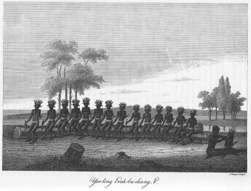 Mdng-en-ny-wau-yen-go-nah, bar-ri-boo-lah, bar-re-mah. This they begin at the top of their voices, and continue as long as they can in one breath, sinking to the lowest note, and then rising again to the highest. The words are the names of deceased persons.