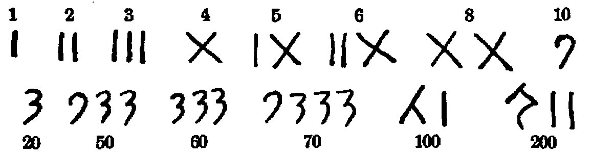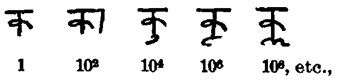 It should be stated definitely at the outset, however, that we are not at all sure that the most ancient forms of the numerals commonly known as Arabic had their origin in India. As will presently be seen, their forms may have been suggested by those used in Egypt, or in Eastern Persia, or in China, or on the plains of Mesopotamia. We are quite in the dark as to these early steps; but as to their development in India, the approximate period of the rise of their essential feature of place value, their introduction into the Arab civilization, and their spread to the West, we have more or less definite information. When, therefore, we consider the rise of the numerals in the land of the Sindhu,[51] it must be understood that it is only the large movement that is meant, and that there must further be considered the numerous possible sources outside of India itself and long anterior to the first prominent appearance of the number symbols.