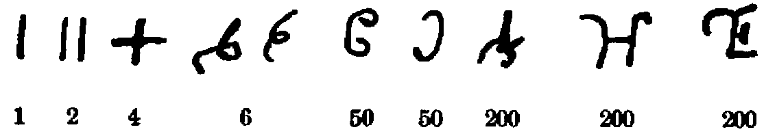 [578] From the Regensburg chronicle. Plate containing some of these numerals in Monumenta Germaniae historica, "Scriptores" Vol. XVII, plate to p. 184; Wattenbach, Anleitung zur lateinischen Palaeographie, Leipzig, 1886, p. 102; Boehmer, Fontes rerum Germanicarum, Vol. III, Stuttgart, 1852, p. lxv.