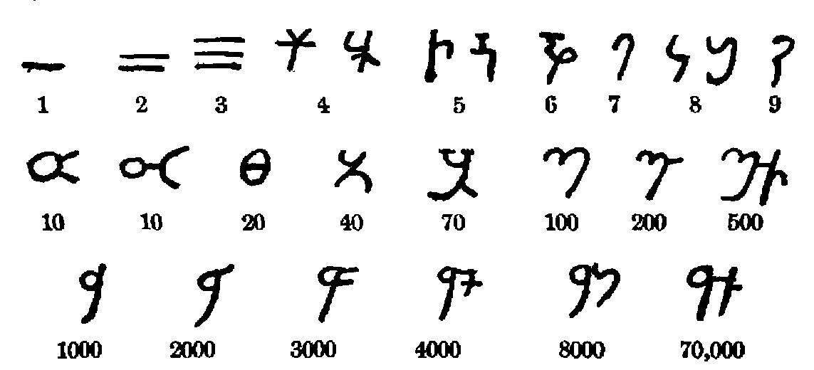 It has long been recognized that the common numerals used in daily life are of comparatively recent origin. The number of systems of notation employed before the Christian era was about the same as the number of written languages, and in some cases a single language had several systems. The Egyptians, for example, had three systems of writing, with a numerical notation for each; the Greeks had two well-defined sets of numerals, and the Roman symbols for number changed more or less from century to century. Even to-day the number of methods of expressing numerical concepts is much greater than one would believe before making a study of the subject, for the idea that our common numerals are universal is far from being correct. It will be well, then, to think of the numerals that we still commonly call Arabic, as only one of many systems in use just before the Christian era. As it then existed the system was no better than many others, it was of late origin, it contained no zero, it was cumbersome and little used, [2]and it had no particular promise. Not until centuries later did the system have any standing in the world of business and science; and had the place value which now characterizes it, and which requires a zero, been worked out in Greece, we might have been using Greek numerals to-day instead of the ones with which we are familiar.