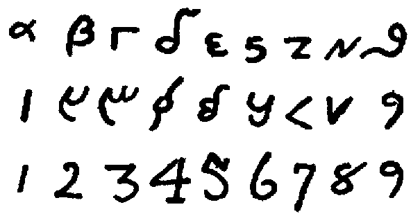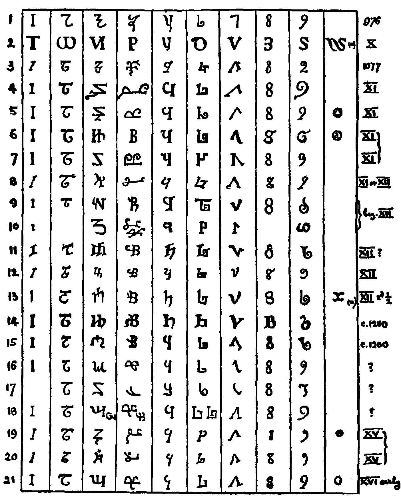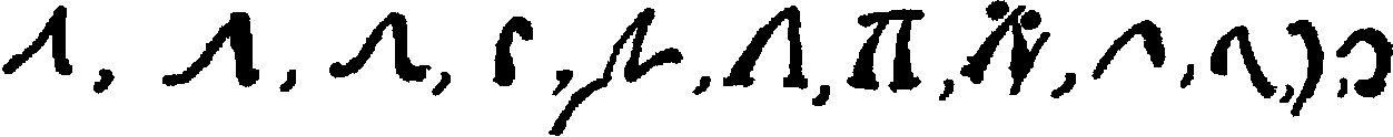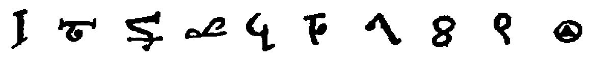 [592] The first of these is from a French algorismus, c. 1275. The second and the following eight characters are given by Cappelli, loc. cit., and are from manuscripts of the twelfth (2), thirteenth, fourteenth, fifteenth (3), seventeenth, and eighteenth centuries, respectively.