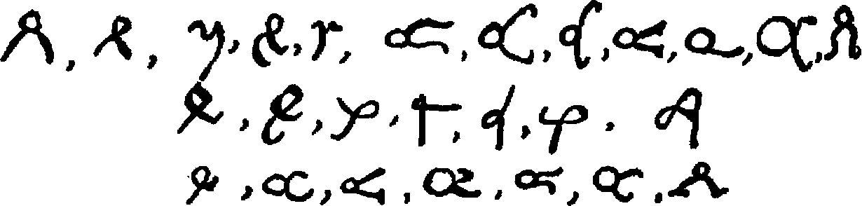 [597] Cappelli, loc. cit. They are partly from manuscripts of the tenth, twelfth, thirteenth (3), fourteenth (7), fifteenth (6), and eighteenth centuries, respectively. Those in the third line are from Chassant's Dictionnaire, p. 113, without mention of dates.