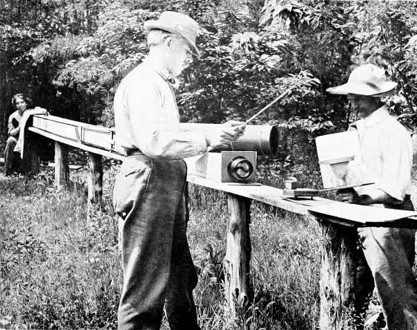 The camera, consisting of several long boxes which fit into one another, is stretched on a table made of board and a number of posts set in the ground. At one end is the lens and at the other, the ground glass plate to focus the image on. The monster is mounted on a small wooden block and set up the proper distance in front of the lens. It is moved back and forth in response to directions from the operator, at the other end of the camera, who is watching the image on the ground glass. Lying on the camera above the lens is a black paper cone which, when everything is ready, is put over the lens between it and the monster to prevent the smoke from the flash powder from drifting between the lens and the insect during the exposure. Wills, the assistant, is holding the Prosch magnesium blow lamp, and the insect is shaded from the direct rays of the sun by a large pane of glass covered with a thin sheet of tissue paper. Direct sunlight is reflected from the hairs and polished surfaces of the insects and makes spots on the negative.