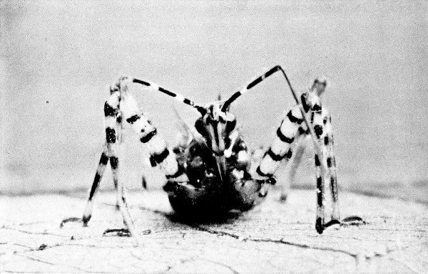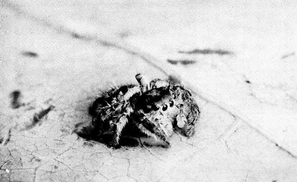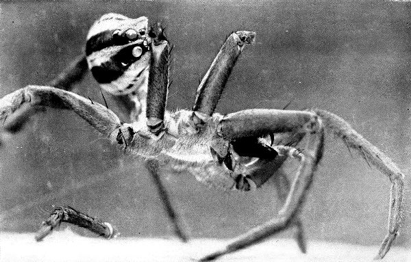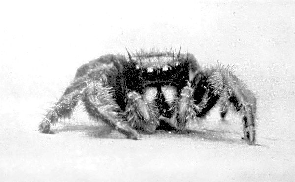 This one has eight eyes, four of which are invisible from the front. The eyes are diurnal, enabling the creature to hunt only by day. Its eight stout legs fit it for jumping forward or sideways with great ease. In comparison with its size, its jumping powers are incredible. If it were the size of a tiger, it would be a beast of prey which could clear a quarter of a mile at a bound.