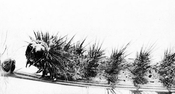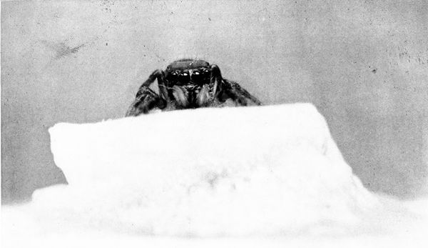 It can sit on a branch and throw out an elastic dragline behind, strong enough to bear its weight, and by this means it is able to jump at and catch its prey on the fly, regaining its position by climbing up the dragline. Add to this that it possesses a pair of powerful hollow fangs, into which poison sacs empty, and a voraciousness which often leads it into cannibalism, and you have a fair picture of this jumping spider, which is one of a thousand species of little creatures found everywhere except in the polar regions. They range in size from a third to a half an inch long and live under stones and sticks, spending the winter in a silken bag of their own manufacture, but never spinning a web. The males of some species have been observed to dance before the females, holding up their hairy legs above their heads apparently to show off their ornamentation.