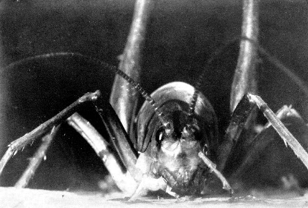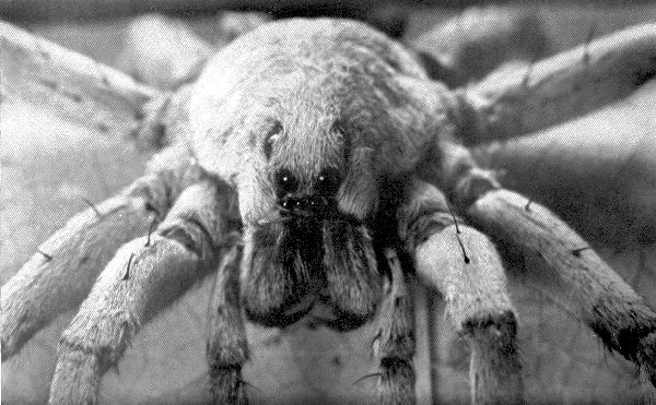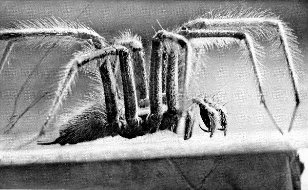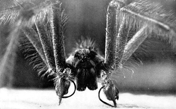 Behind and above the fangs and hidden in their shadow is the creature’s mouth, toothless and made for sucking only. With his fangs, this wolf-spider kills and crushes his victim; then he sucks the body dry and throws away the carcass.