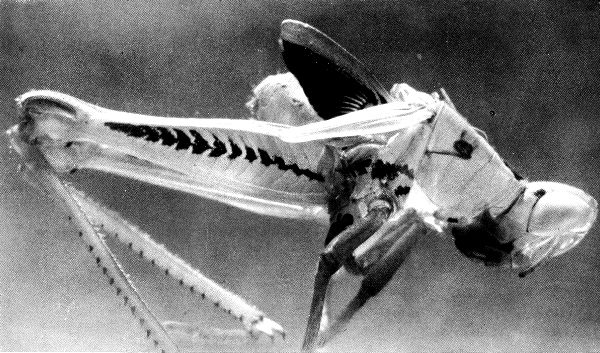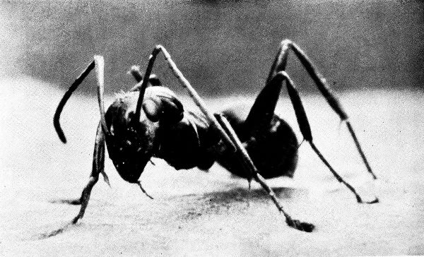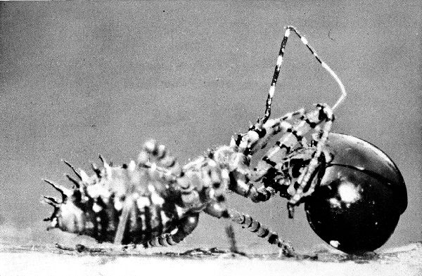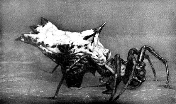 Some have powers of flight which enable them to sail a thousand miles before the wind. Others can jump a hundred times their own length. One of these monsters can manufacture a liquid rope as easily as mammals produce milk and with it weave aerial nets to trap their prey or, by attaching it, can drop from the dizziest heights without danger, and when the rope has served its purpose they eat it up.