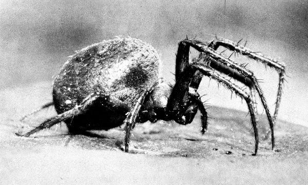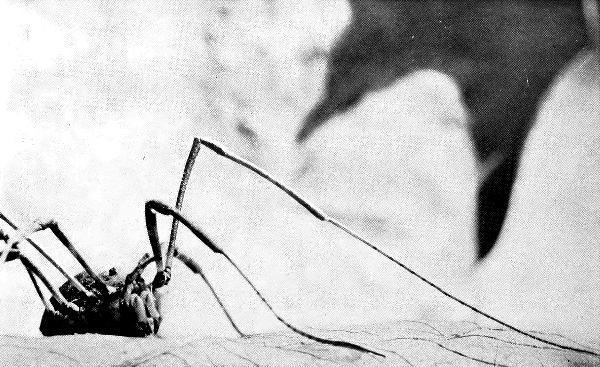 In enlarging the images of these small spiders to many times their size, one is at once struck by their similarity to crabs and lobsters. Their jointed legs encased in shells, which from time to time they shed, remind one strongly of the crabs, and they do in fact belong to the some great family, the family of arthropods, and they are not insects.