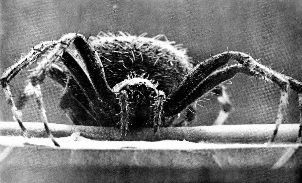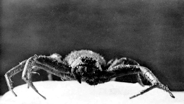 Seen here and there above the body hairs are black spines, hollow inside and connected with the nerves of touch. Of his eyes, the two in the center in front are supposed to be for use by day, while all the others are nocturnal, enabling him to stalk his prey at dusk. It is the wolf-spider that often appears at night within the circle of lamplight searching for nocturnal insects.