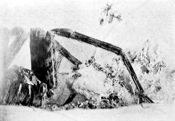 [Pg 9]The taking of the photographs is not, however, the hardest work of monster photographing, although perhaps the hottest, for in summer it is no joke to swelter under a focusing cloth for half an hour at a time, and the focusing itself is hard on the eyes. It is the mounting of the beasts which wears upon one’s nerves, and here is where the woman’s skill comes, for Mrs. Fairchild learned the art of insect taxidermy and many of the most lifelike photographs in the book were mounted by her.