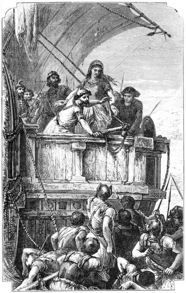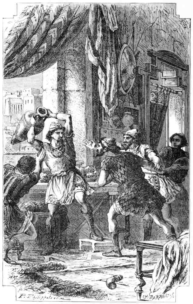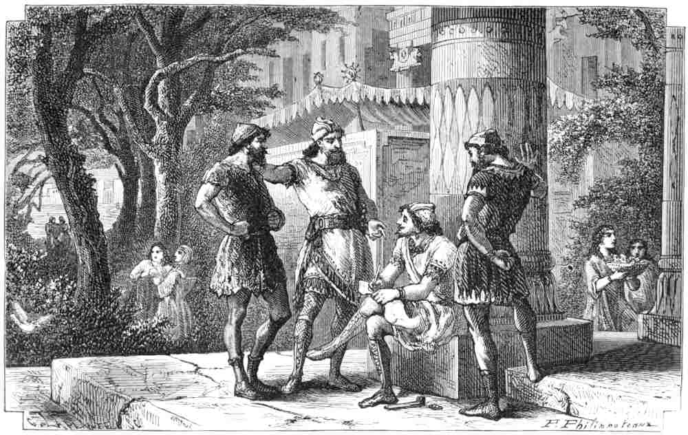 All Phœnicia knows how I superintended the floating of [Pg 336] the cedar-wood and all the materials which King Solomon required for the magnificent temple he was rearing at Jerusalem. Chamai is a captain in King Solomon's army, and is invariably recognised with every token of respect when he comes with Abigail, his wife, to visit me at the Admiralty palace. Every one, too, knows Bichri, the rich vine-dresser, who periodically comes to Sidon to sell his barrels and skins of sparkling wine, always inviting Himilco to the first taste of the produce of his vineyards; whilst every year a vessel is sent with all due pomp to Paphos to bring Hanno, the high priest of Ashtoreth, with the lovely Chryseis, her priestess and his wife, to sacrifice in the temple of their great metropolis. Dionysos, who has become a distinguished instructor of his countrymen in navigation, and Aminocles, his proud and aged father, generally accompany them.