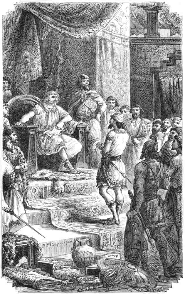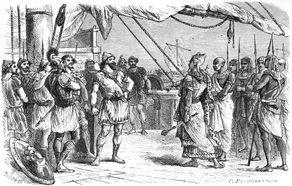 I took my leave of the King and rejoined Hanno my scribe and Himilco my pilot, the latter of whom had been my constant associate on my previous voyages. They were sitting on the side-bench at the great gate of the palace, [Pg 3] and had been impatiently awaiting my return, mutually speculating upon the reason that had induced the King to send for us from Sidon, and naturally conjecturing that it must relate to some future enterprise and adventure. At the first glimpse of my excited countenance, revealing my delight, Hanno exclaimed: