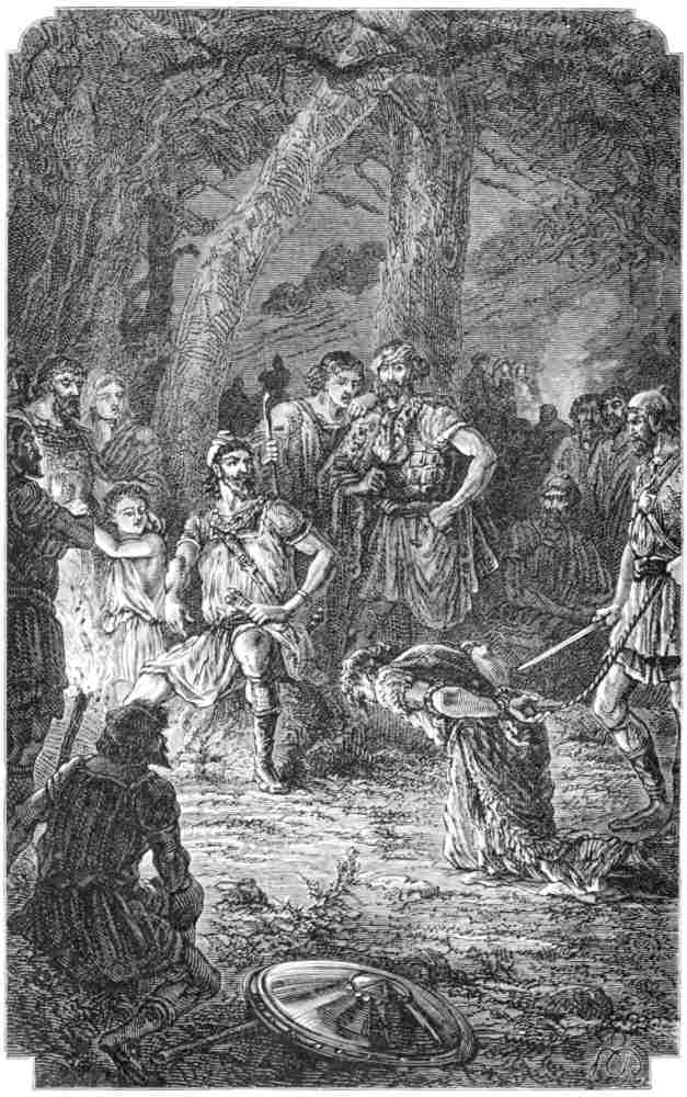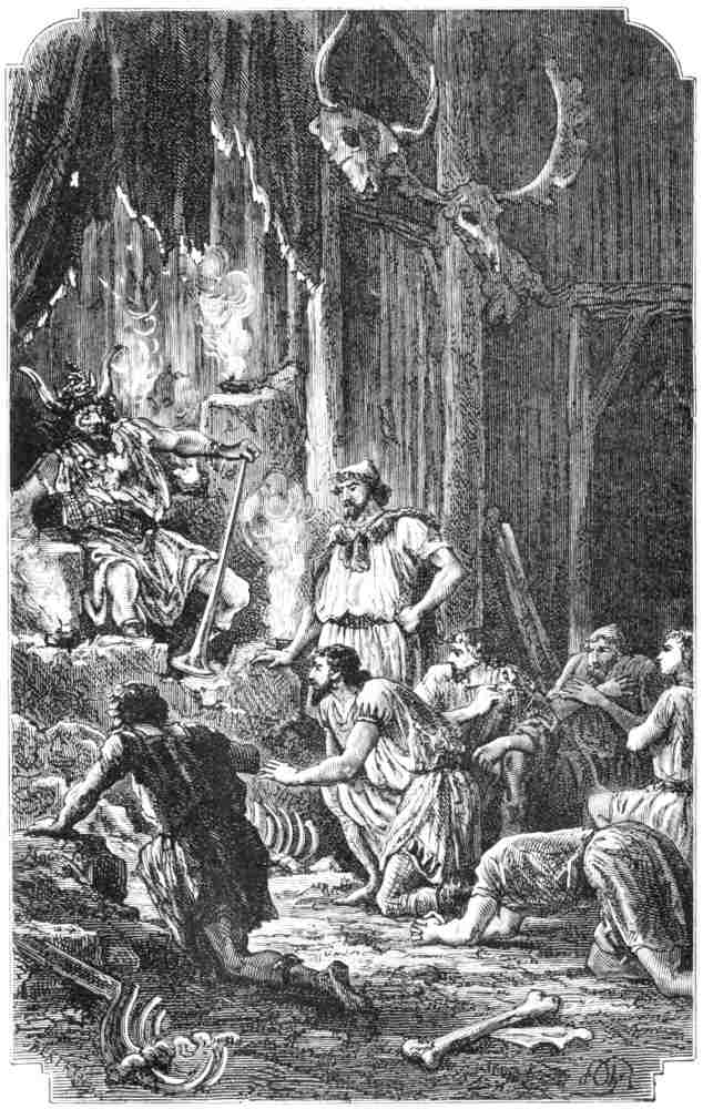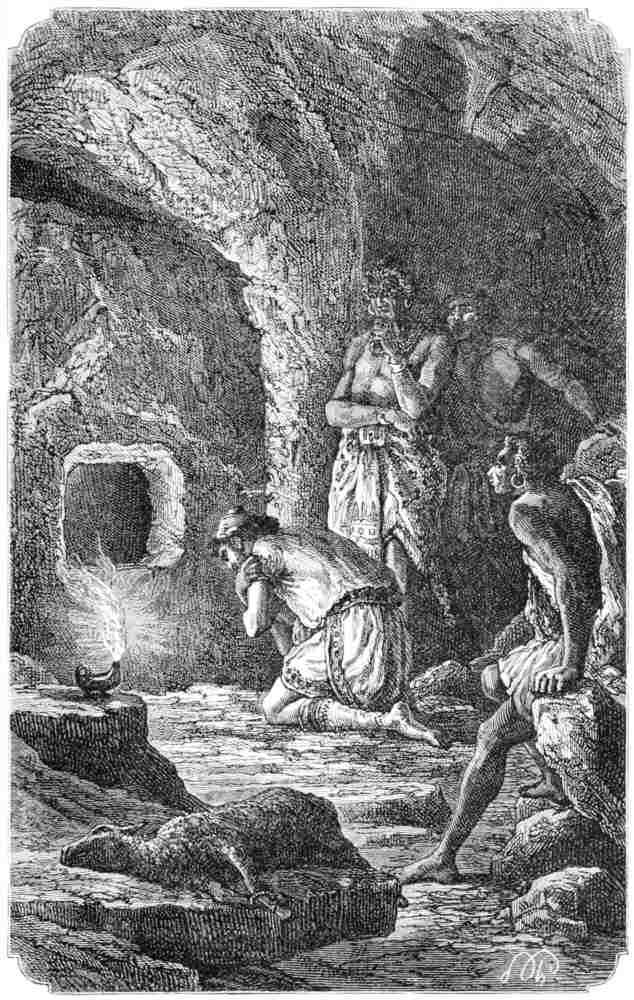 I have represented Mago as sacrificing in a dolmen in the form of a covered avenue below a tumulus. The details are drawn from Bourguignat's Monuments mégalithiques du nord de l'Afrique. M. Daux also gives a description of a similar temple. I profess, however, that I am very far from accepting Bourguignat's theory about rude stone monuments being arranged in the form of serpents, scorpions, and other figures; I am altogether mistrustful of the accounts of prehistoric temples, and am quite of Fergusson's opinion, that these monuments are comparatively modern.—Page 202.