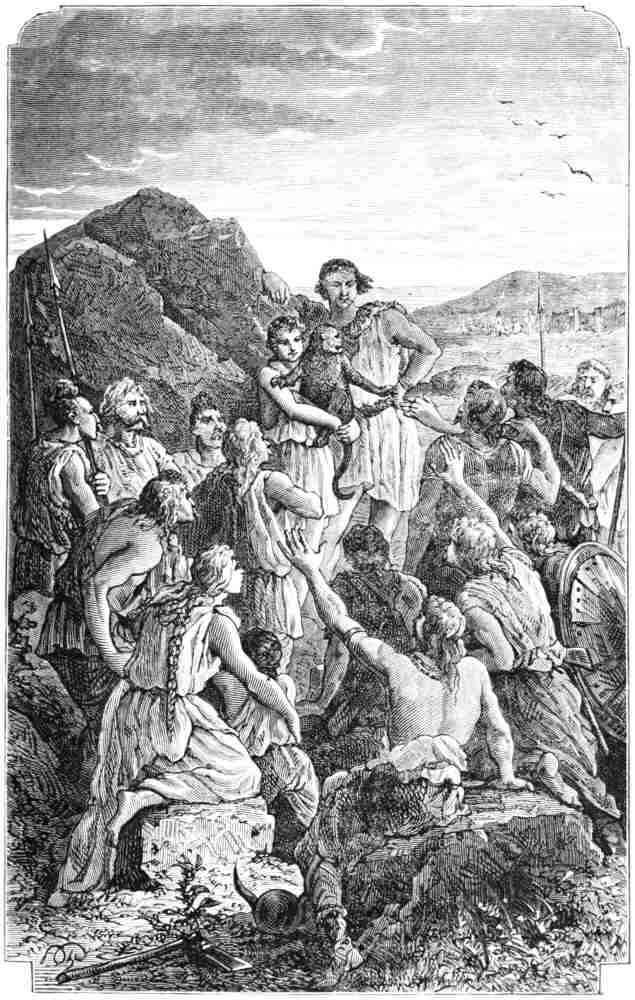 Ar-Mor.—I entertain considerable doubt whether at the period of which I write the Celts had penetrated so far as the west coast of France; but at any rate they were already in the east, and upon the Rhone. I have ascertained the existence of anterior races, such as the Mongoloids and Australoids, and both here and in a subsequent chapter have referred to them. I plead guilty to an anachronism of four whole centuries, but I felt that to the general reader it would seem strange that I should depict my Phœnicians landing in Gaul without meeting with some well known Gallic people; all that I can say in extenuation is that I have endeavoured to construct my story so as to make the anachronism not too flagrant.—Page 244.