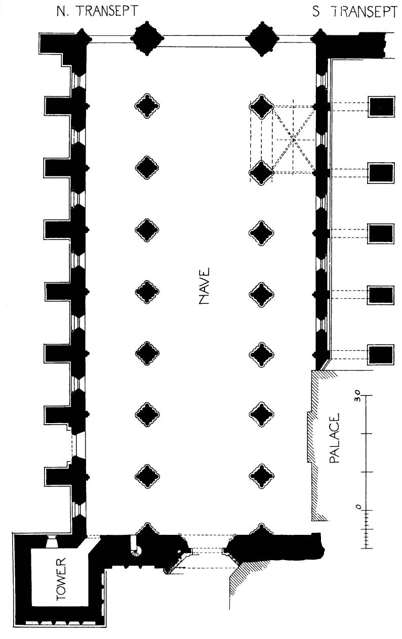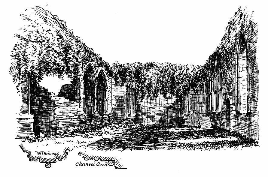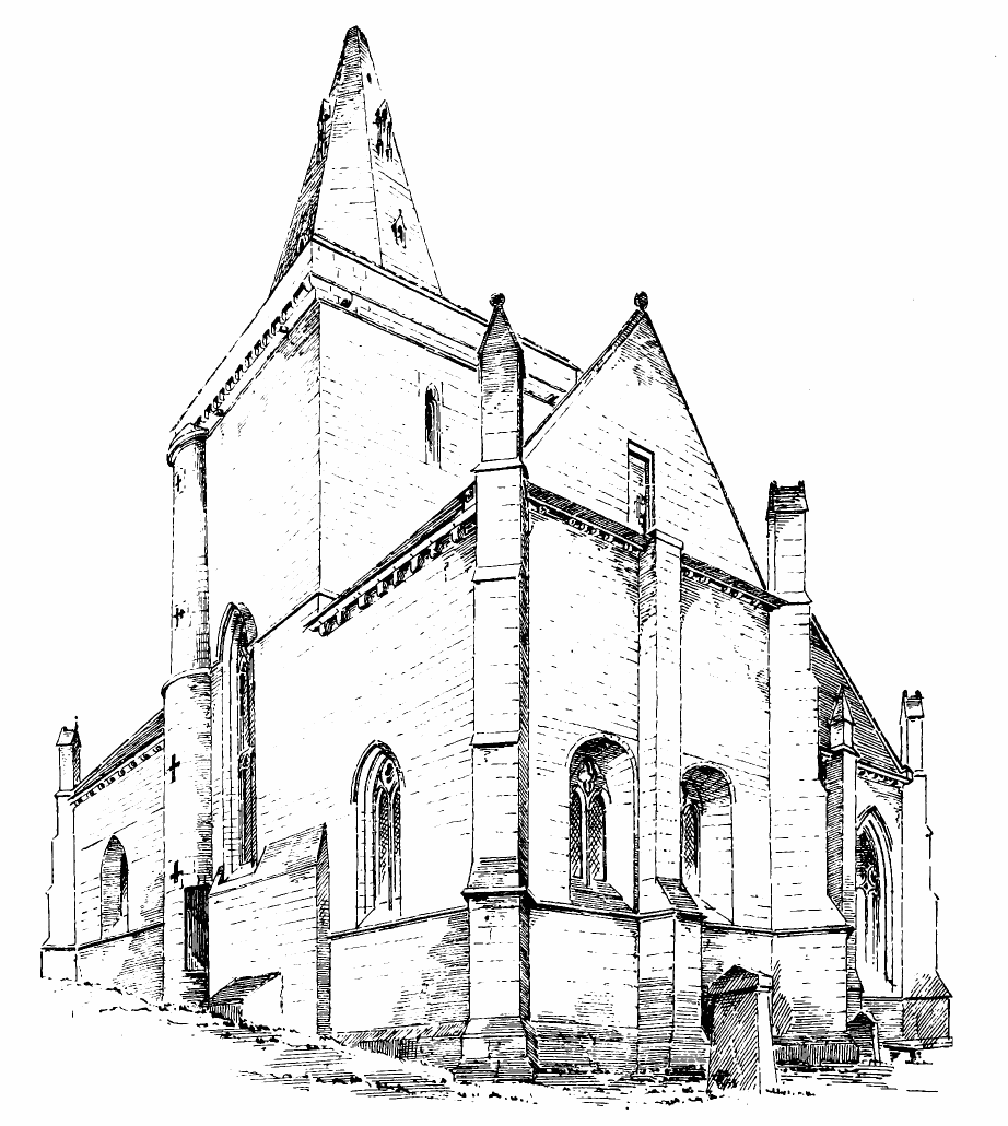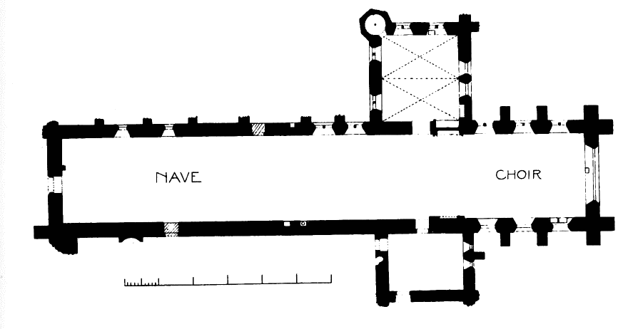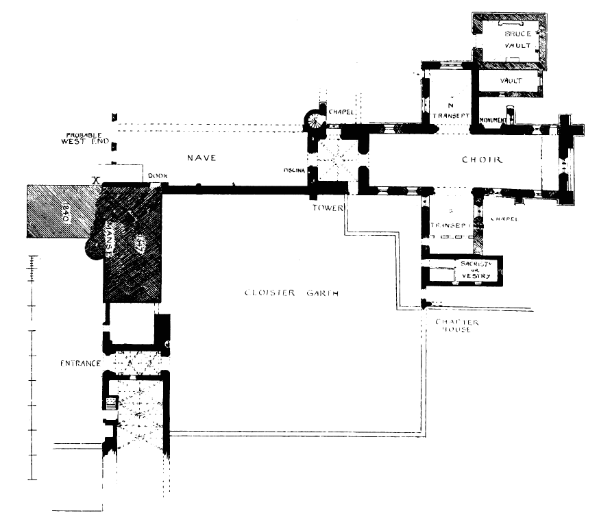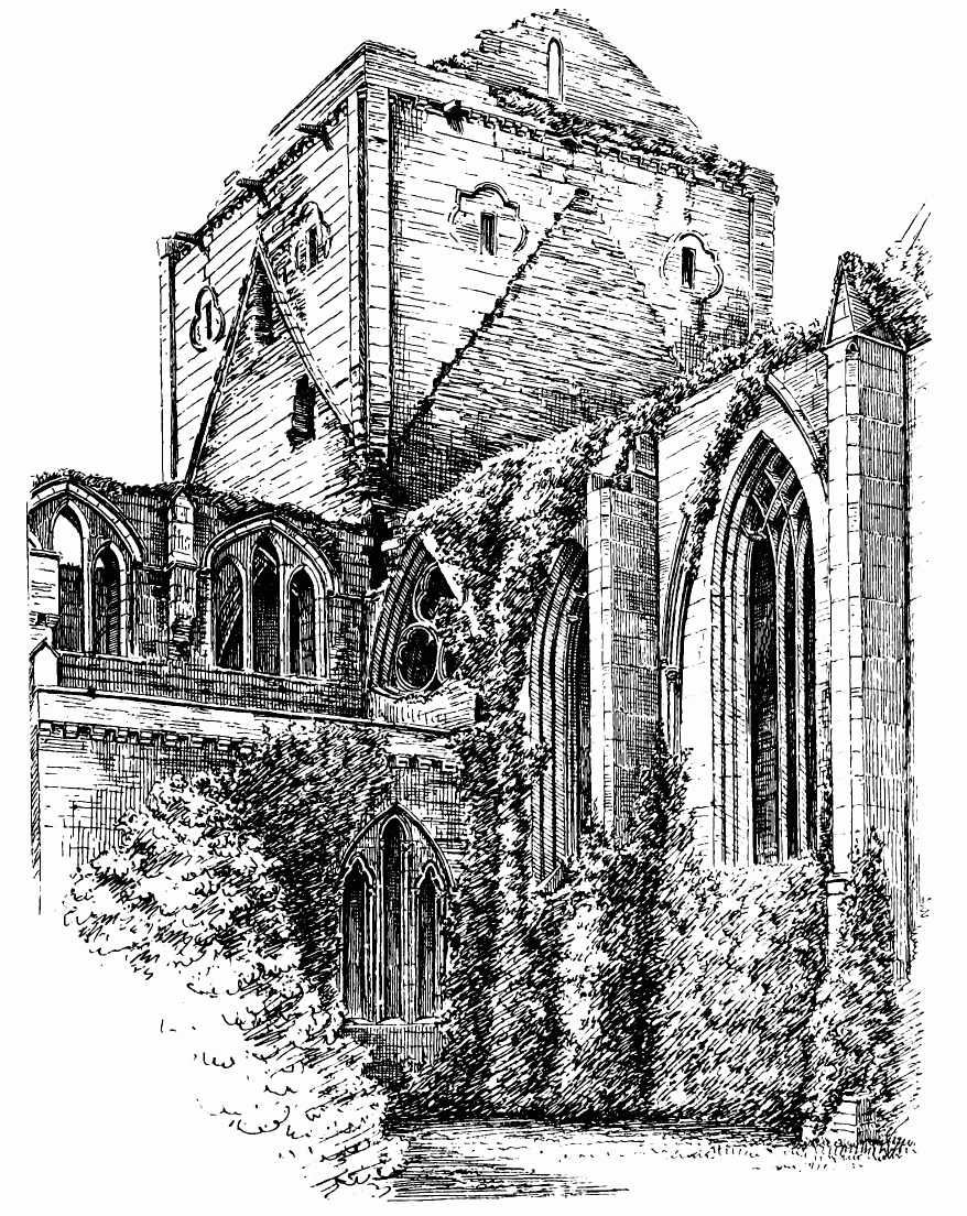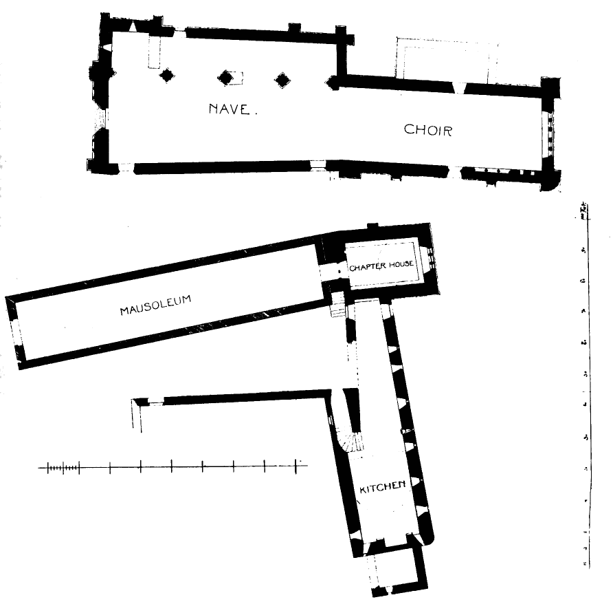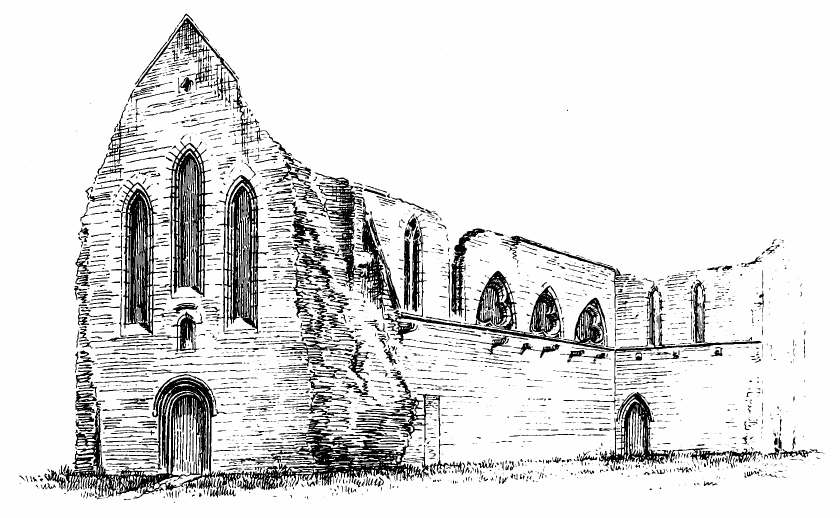 2. That the nave was, to a large extent, rebuilt and roofed by Prior James Bisset, about the beginning of the fifteenth century, but remained an “empty synagogue” till completed and furnished with glazed windows, altars, and decorations by his successor, Prior Halderston.
