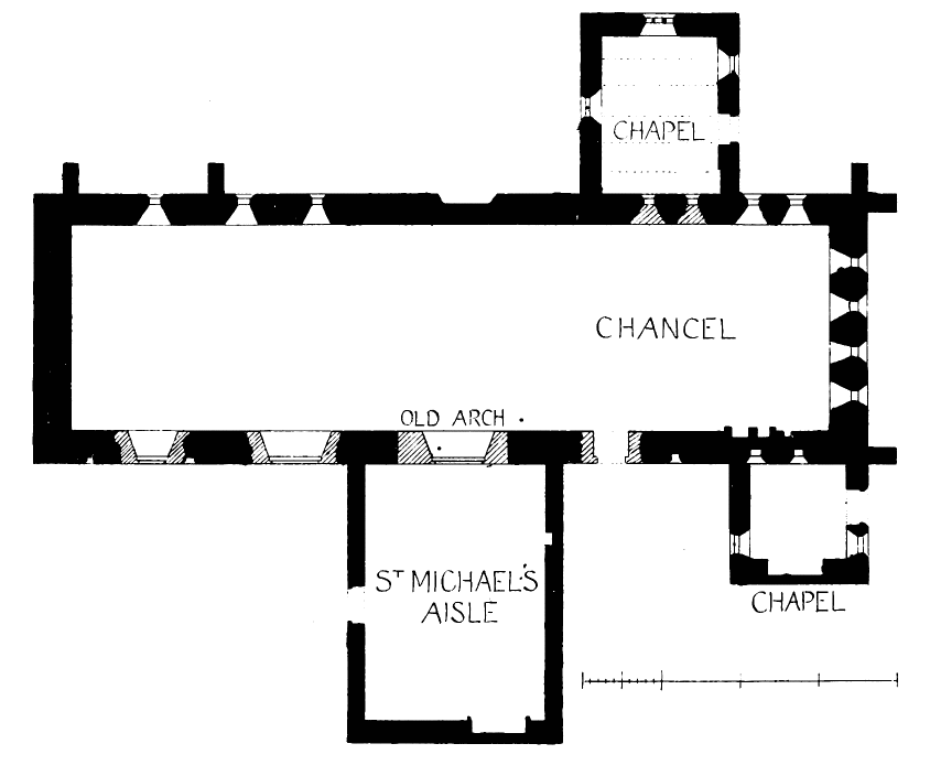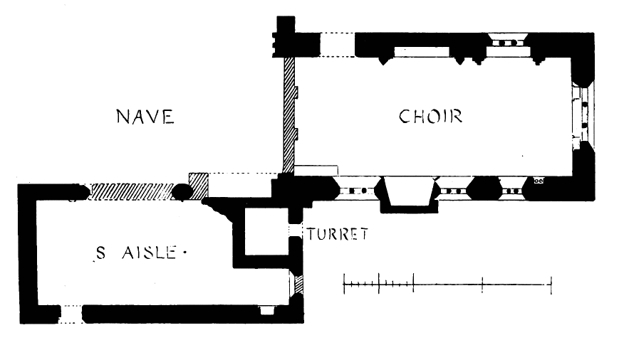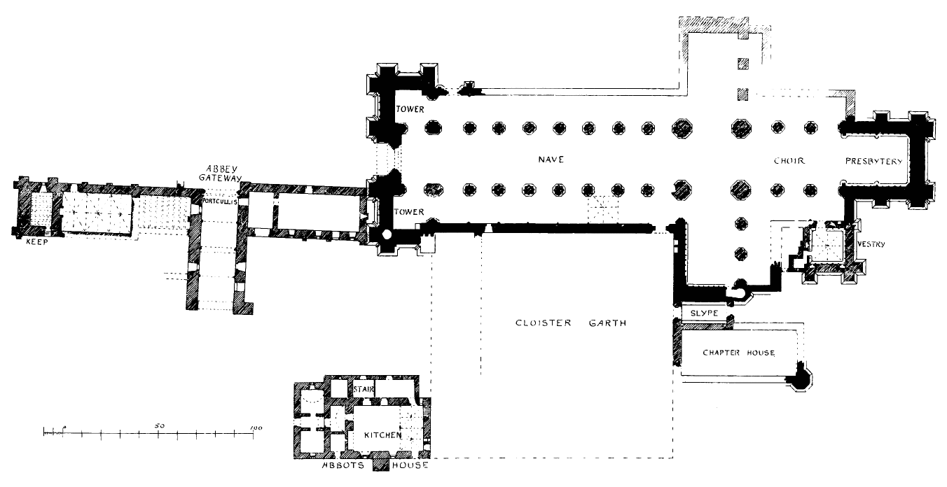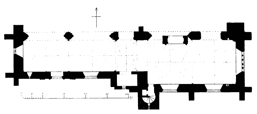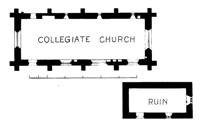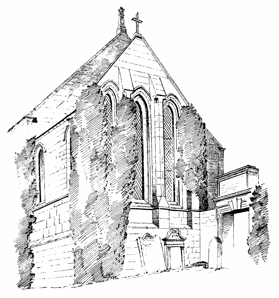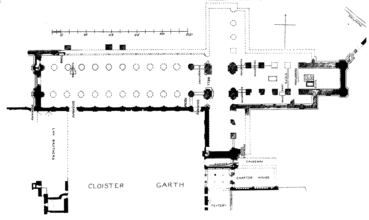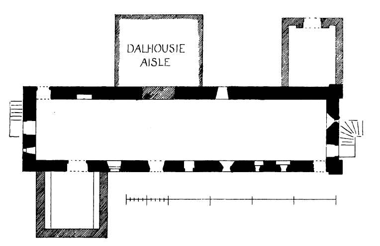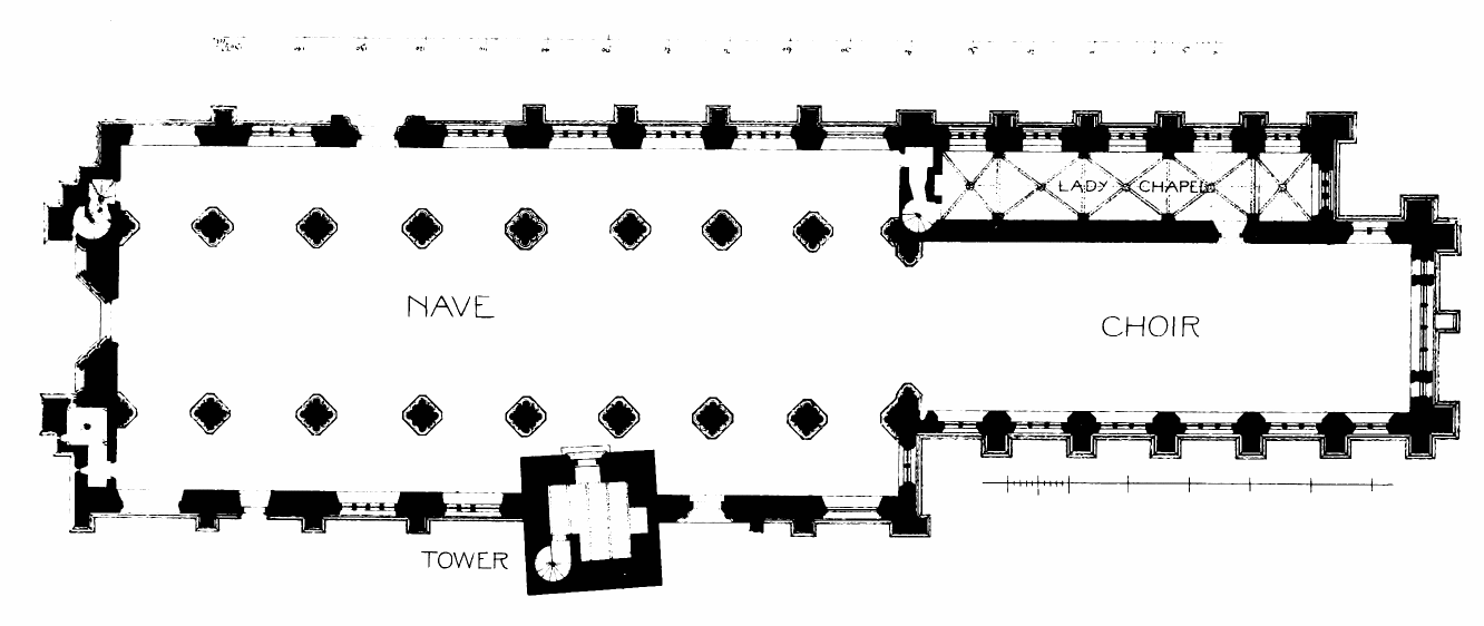 2. That the nave was, to a large extent, rebuilt and roofed by Prior James Bisset, about the beginning of the fifteenth century, but remained an “empty synagogue” till completed and furnished with glazed windows, altars, and decorations by his successor, Prior Halderston.