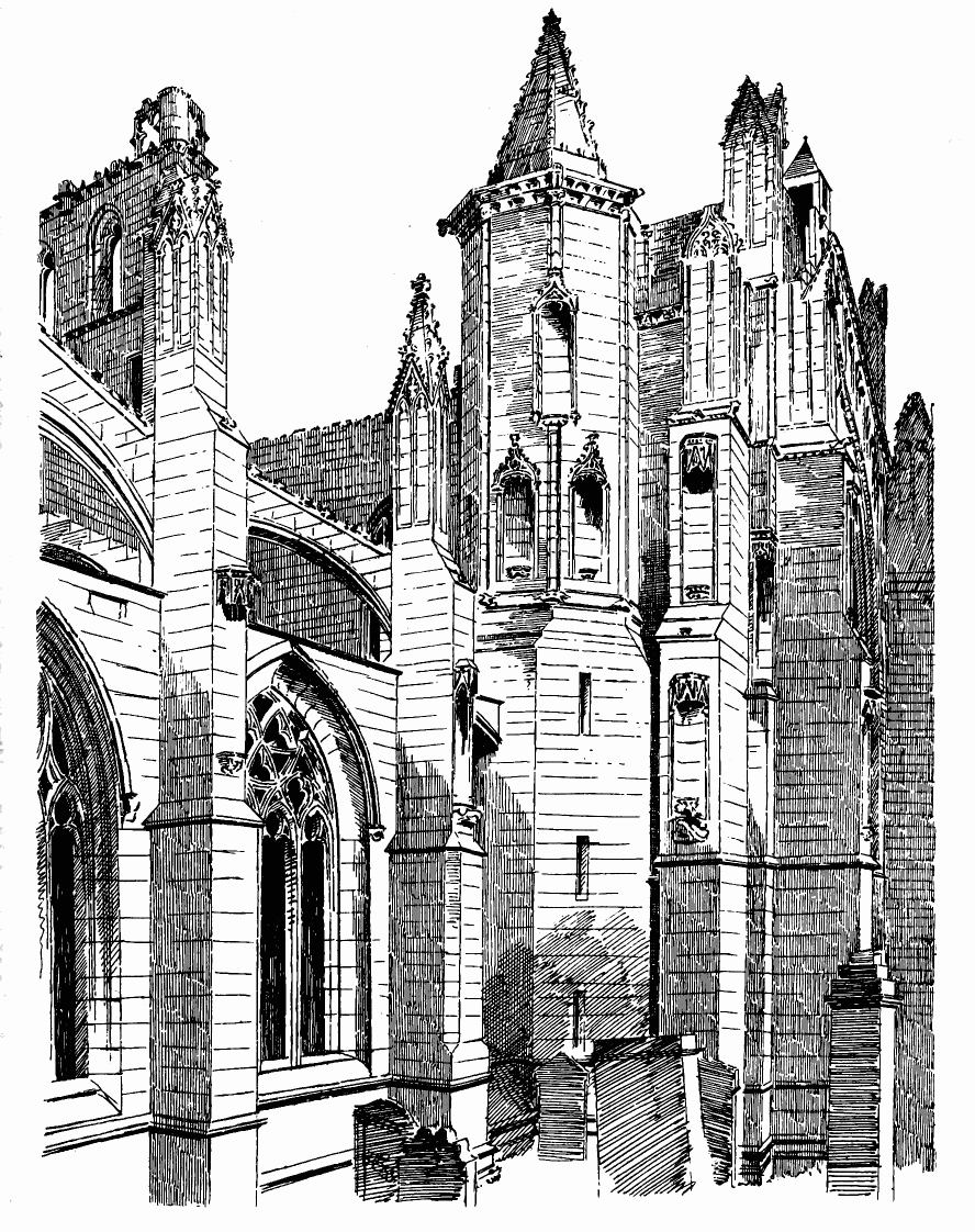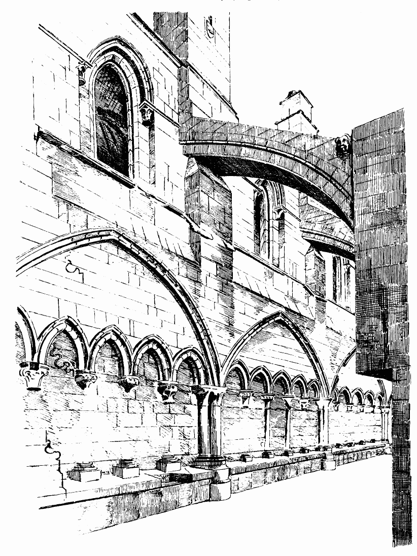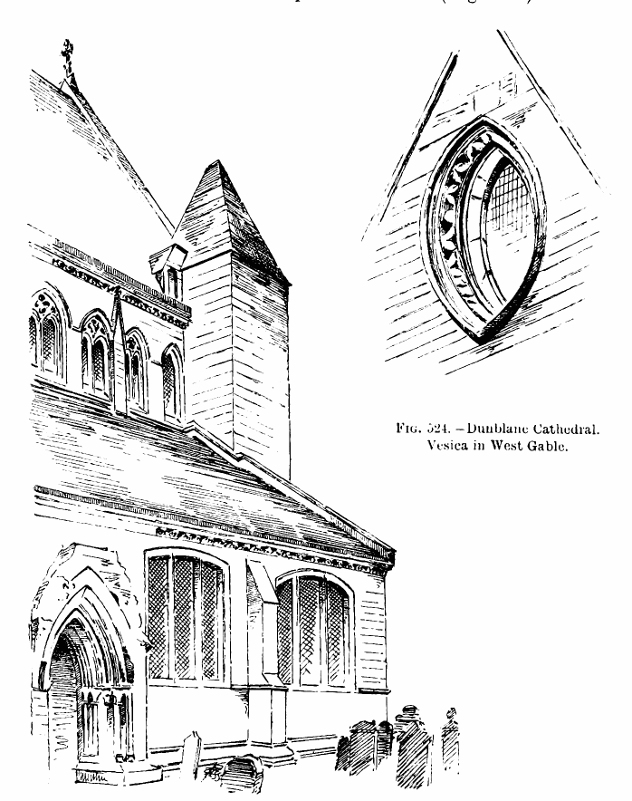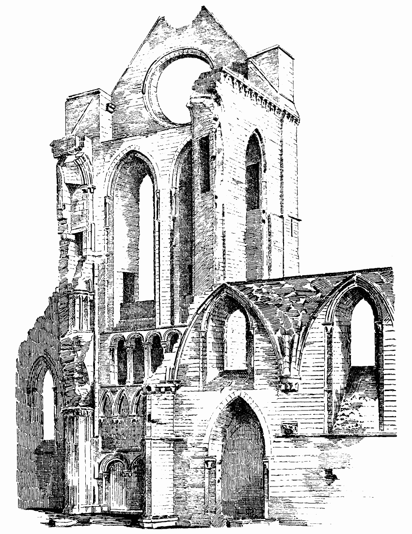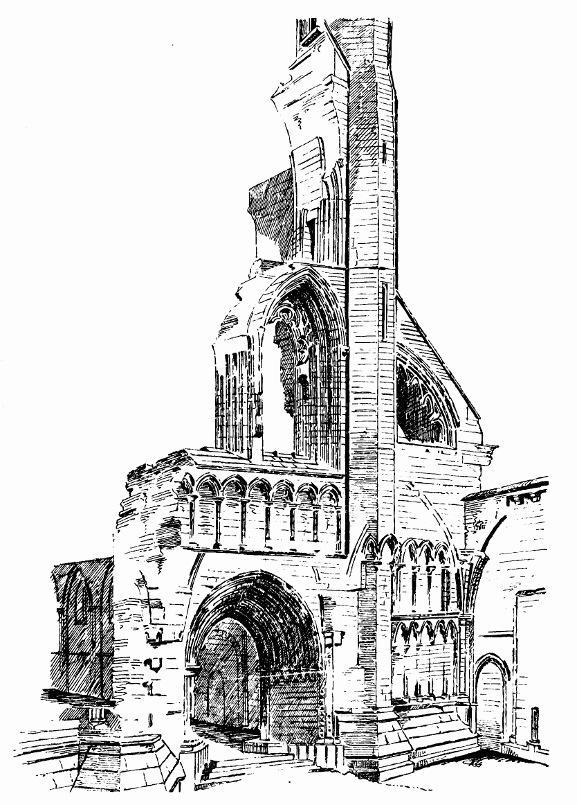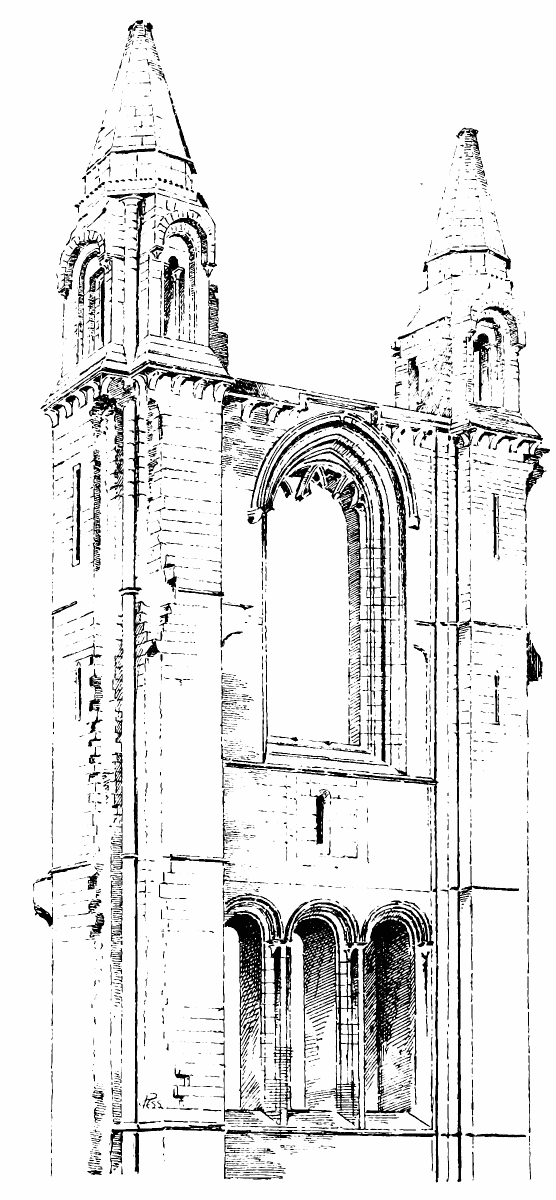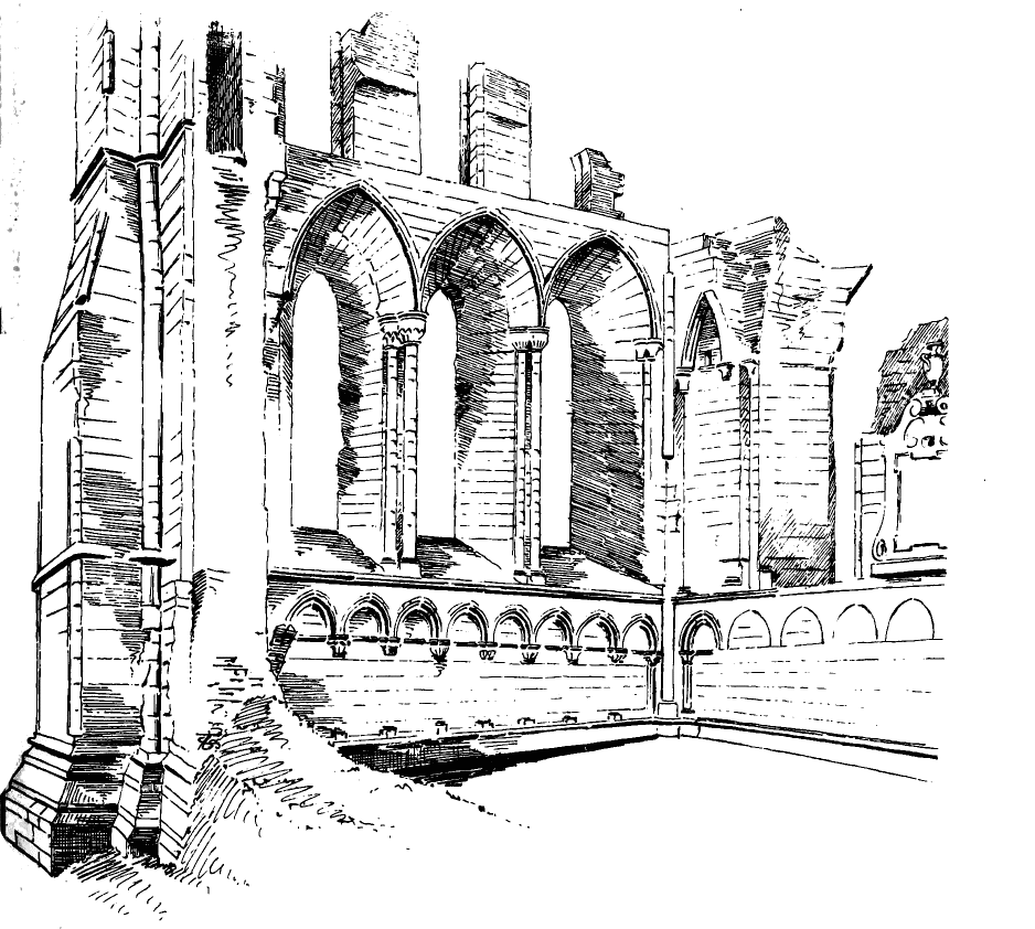 Externally, as well as internally, our Scottish Gothic is somewhat defective in its mode of carrying out the arcuated principles. The wooden roofs so frequently employed really require no buttresses, and, therefore, our buildings are in so far right where in such cases only very slight pilaster-buttresses are used in the triforium, as is the case in Glasgow, Elgin, and Dunblane Cathedrals. In the side aisles, which are vaulted, the buttresses are sometimes heavier, but these features are insignificant as compared with the great flying buttresses and piers of the genuine arcuated or Gothic style of Northern France.