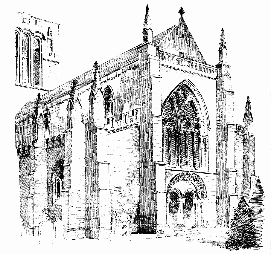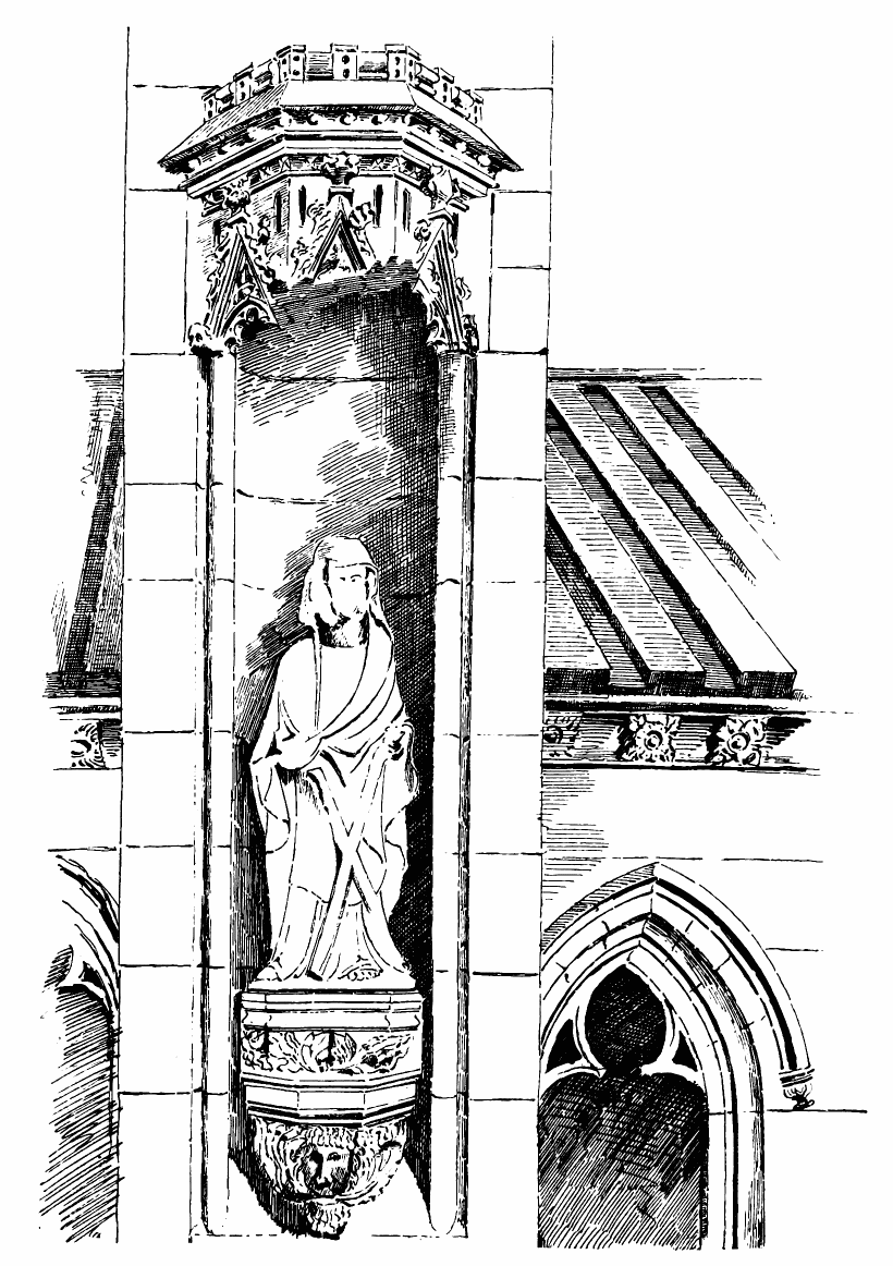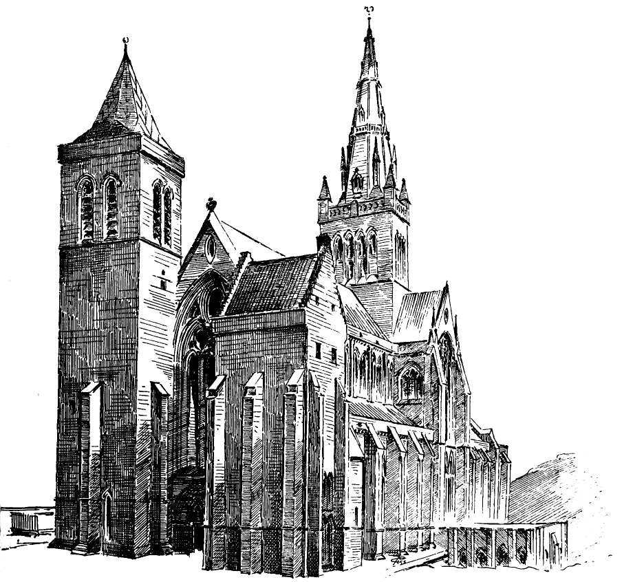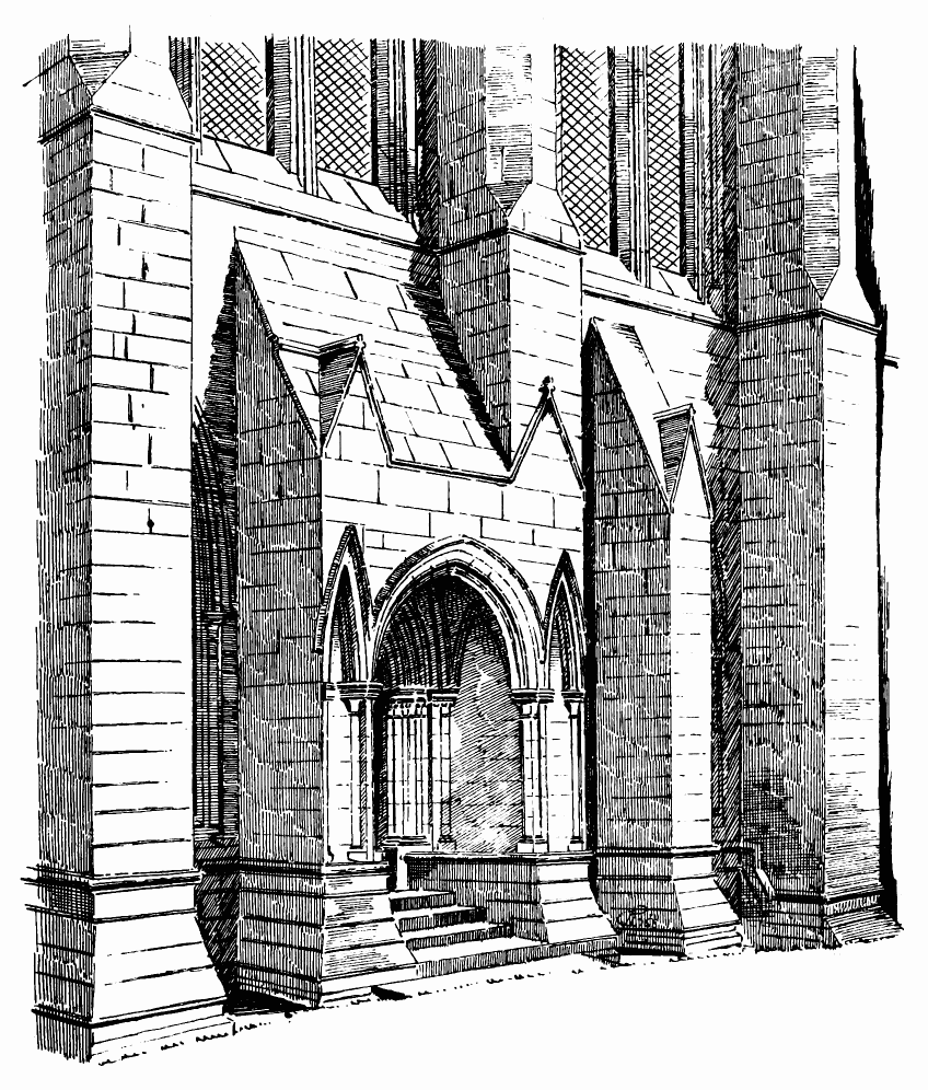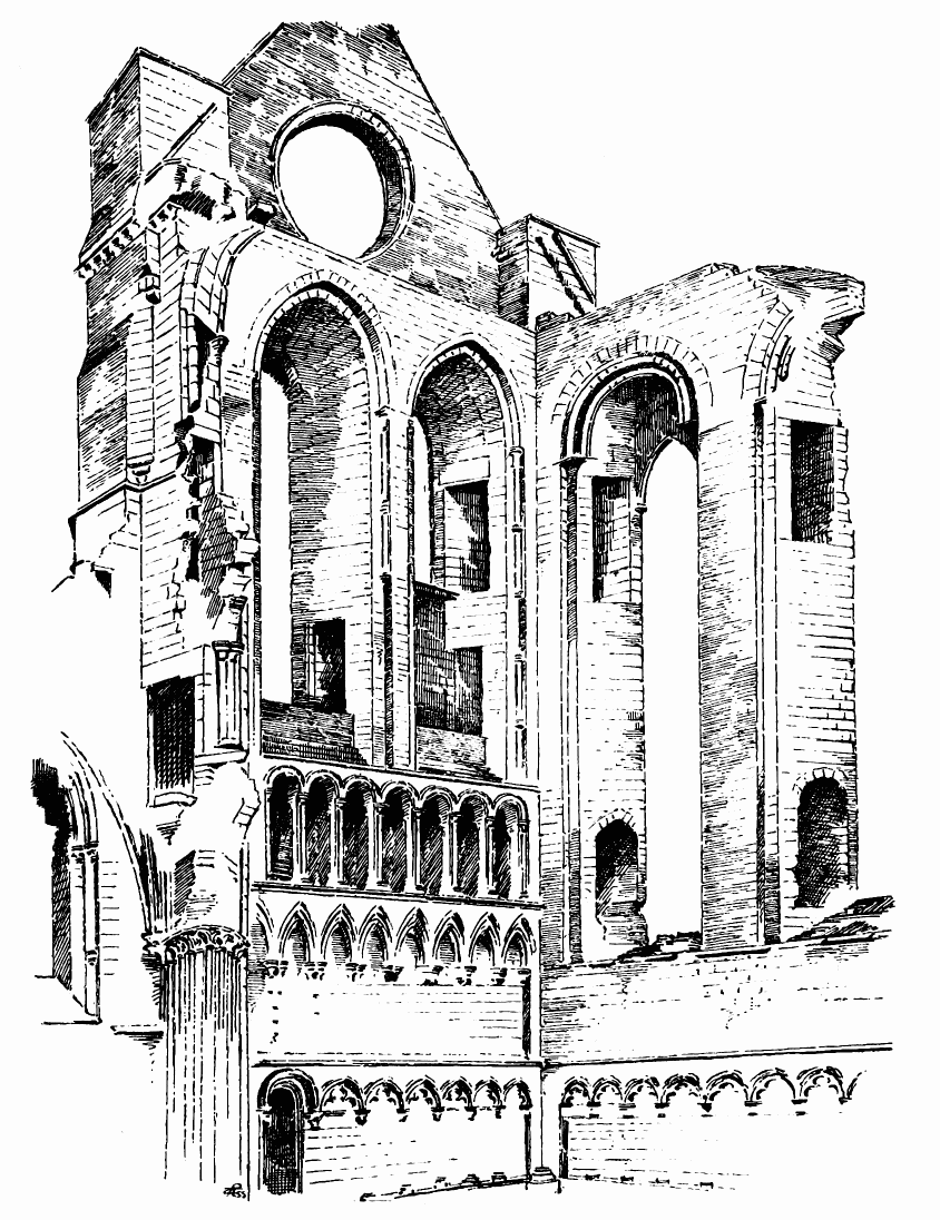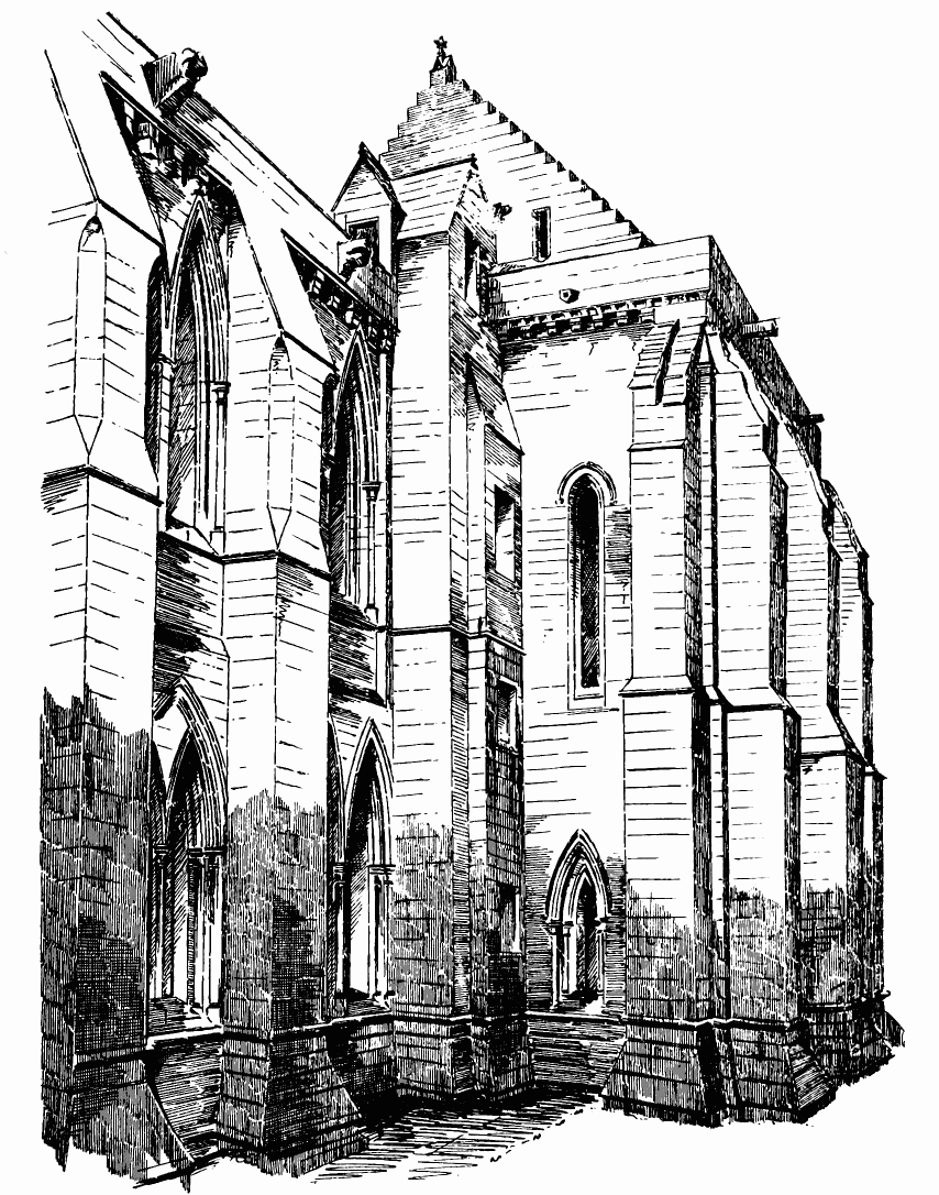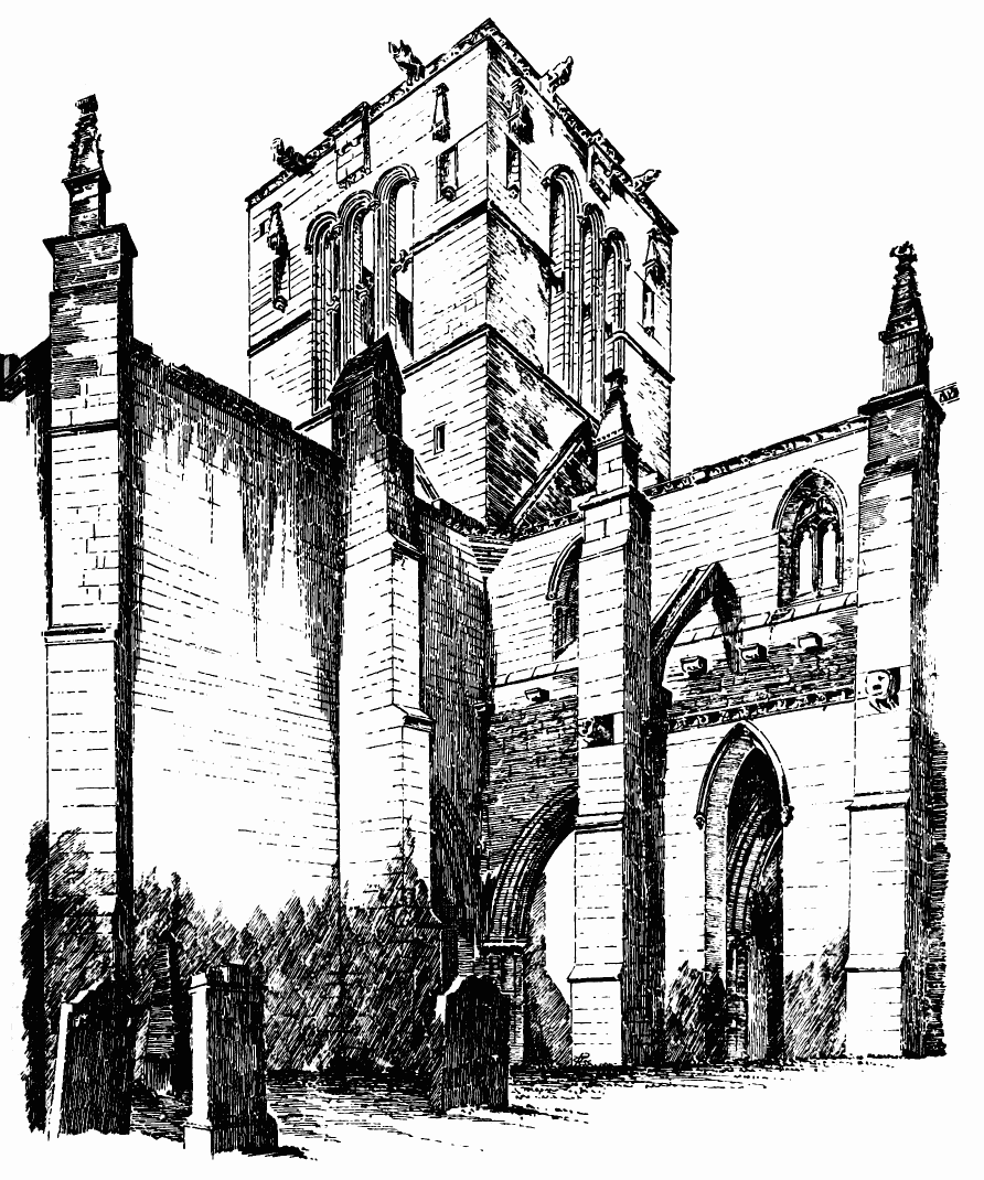 Externally, as well as internally, our Scottish Gothic is somewhat defective in its mode of carrying out the arcuated principles. The wooden roofs so frequently employed really require no buttresses, and, therefore, our buildings are in so far right where in such cases only very slight pilaster-buttresses are used in the triforium, as is the case in Glasgow, Elgin, and Dunblane Cathedrals. In the side aisles, which are vaulted, the buttresses are sometimes heavier, but these features are insignificant as compared with the great flying buttresses and piers of the genuine arcuated or Gothic style of Northern France.