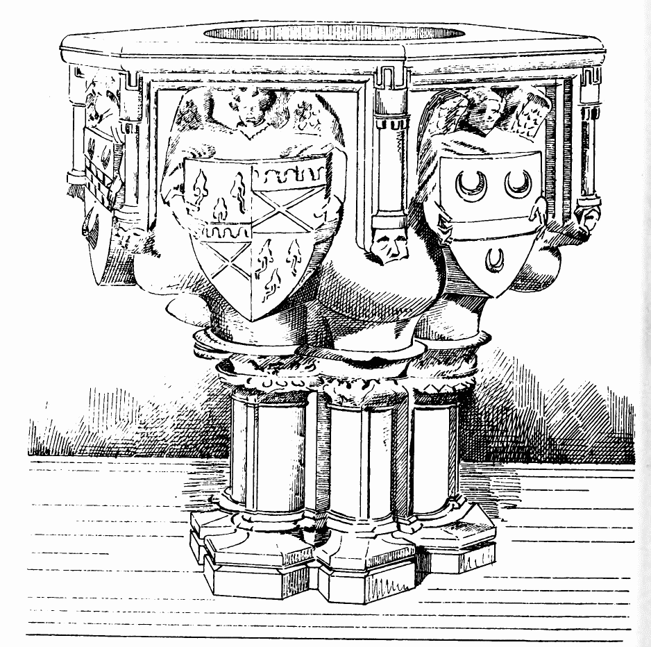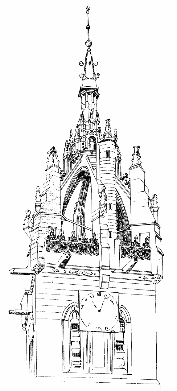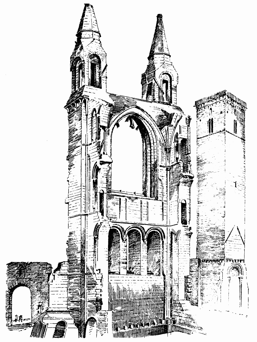 “I only know of one other instance of a permanent stone gallery of one arch crossing the nave; this is at Frankfort, and I got there an architectural work on it. At Frankfort, the imperial throne stood upon it as the Commissioner’s throne used to stand in St. Giles’, Edinburgh, before it was all pulled down a few years ago; the throne of the King of France on the rood loft at Rheims, &c. {xvii}&c. But this throne was not permanent. I believe that at St. Andrews there was this single span arch, bearing a platform, upon which was a great canopy (as in St. Giles’), and under the canopy the royal throne, looking eastwards, and the altar of the crucifix back to back with it (as with the imperial throne and domestic altar in the gallery at Aachen). In the rood loft at Rheims the king’s domestic altar was not back to back with the throne, but at the south end of the gallery at his right hand. Above the roof of the baldaquin or canopy (at St. Andrews), over the throne and altar, I imagine the great rood, with a multitude of ‘sumptuous figures,’ to have towered up towards the roof.”