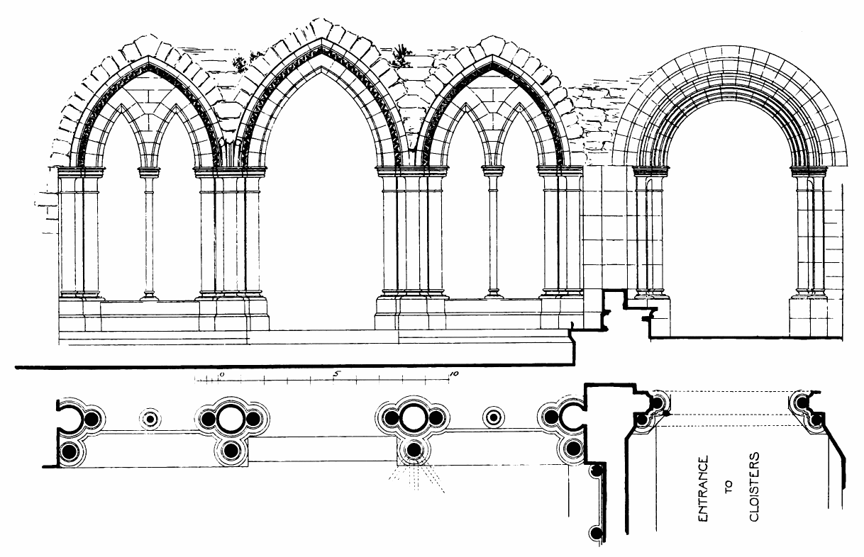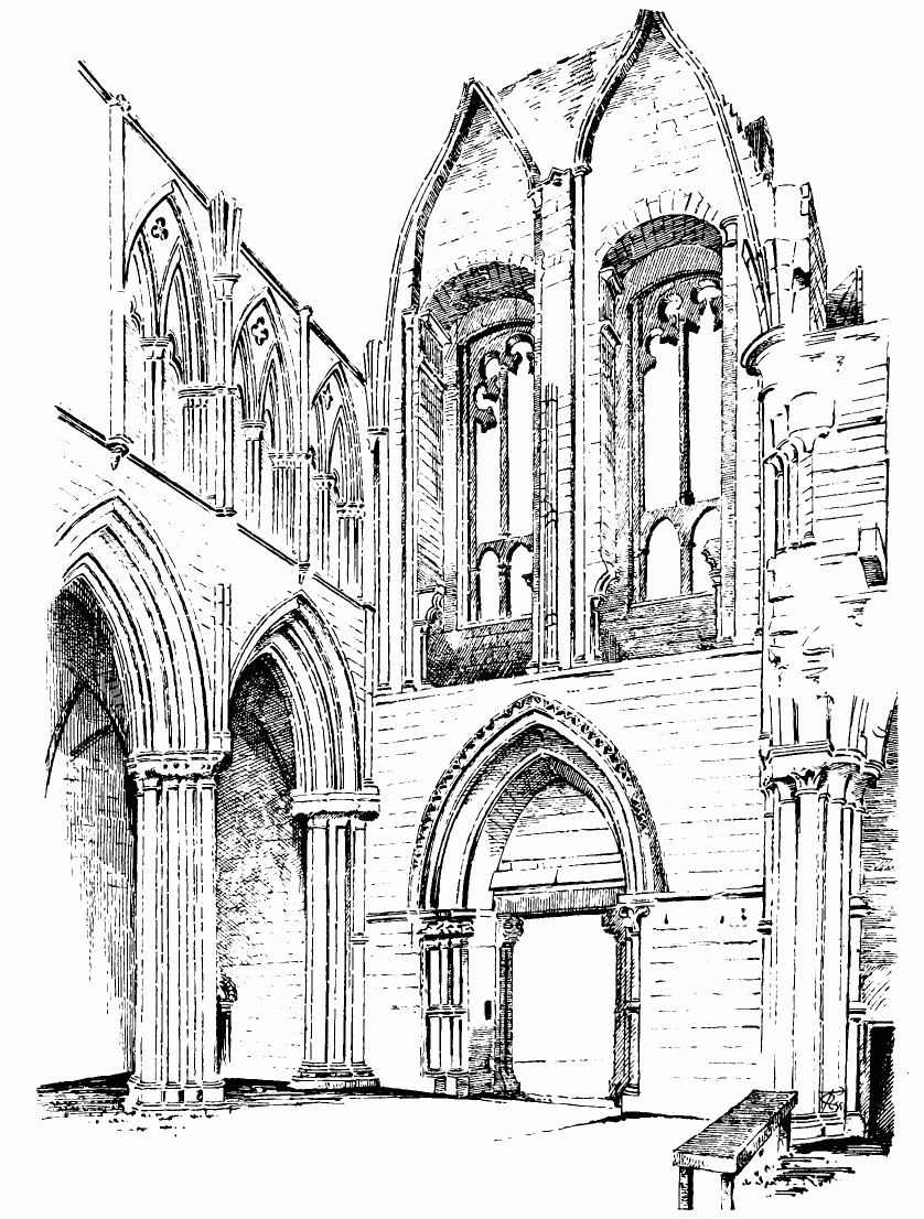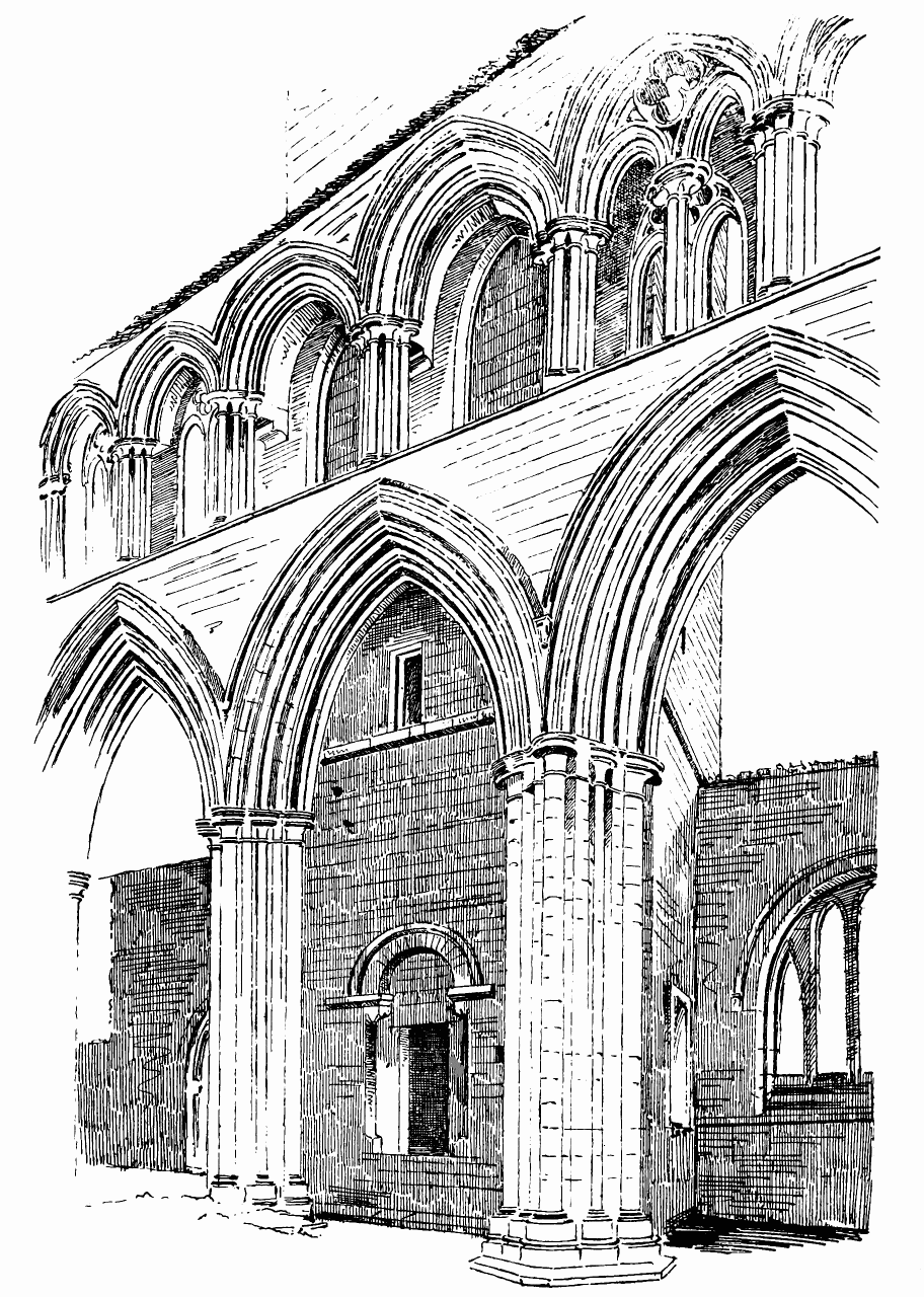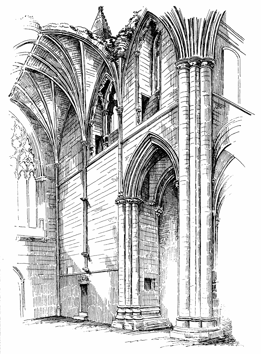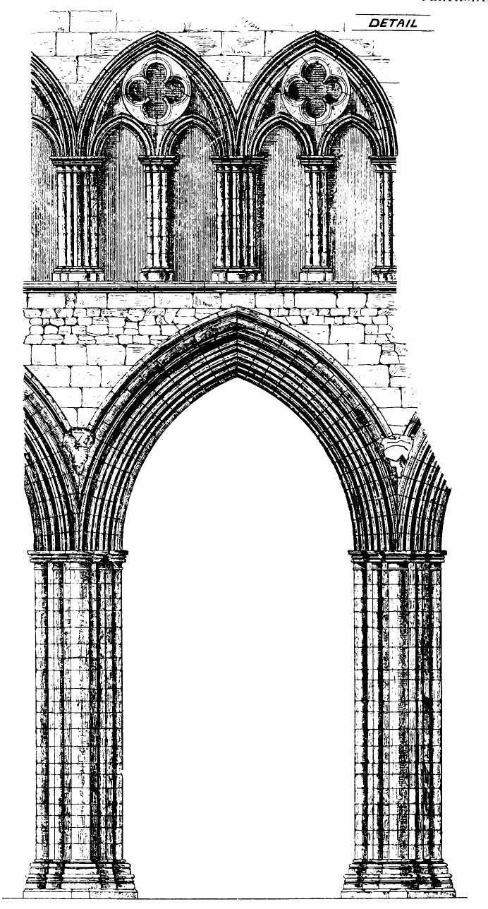 In Elgin Cathedral the vaulting shafts, which are mere{x} beads, descend to the ground, and the clerestory arcade is almost continuous.