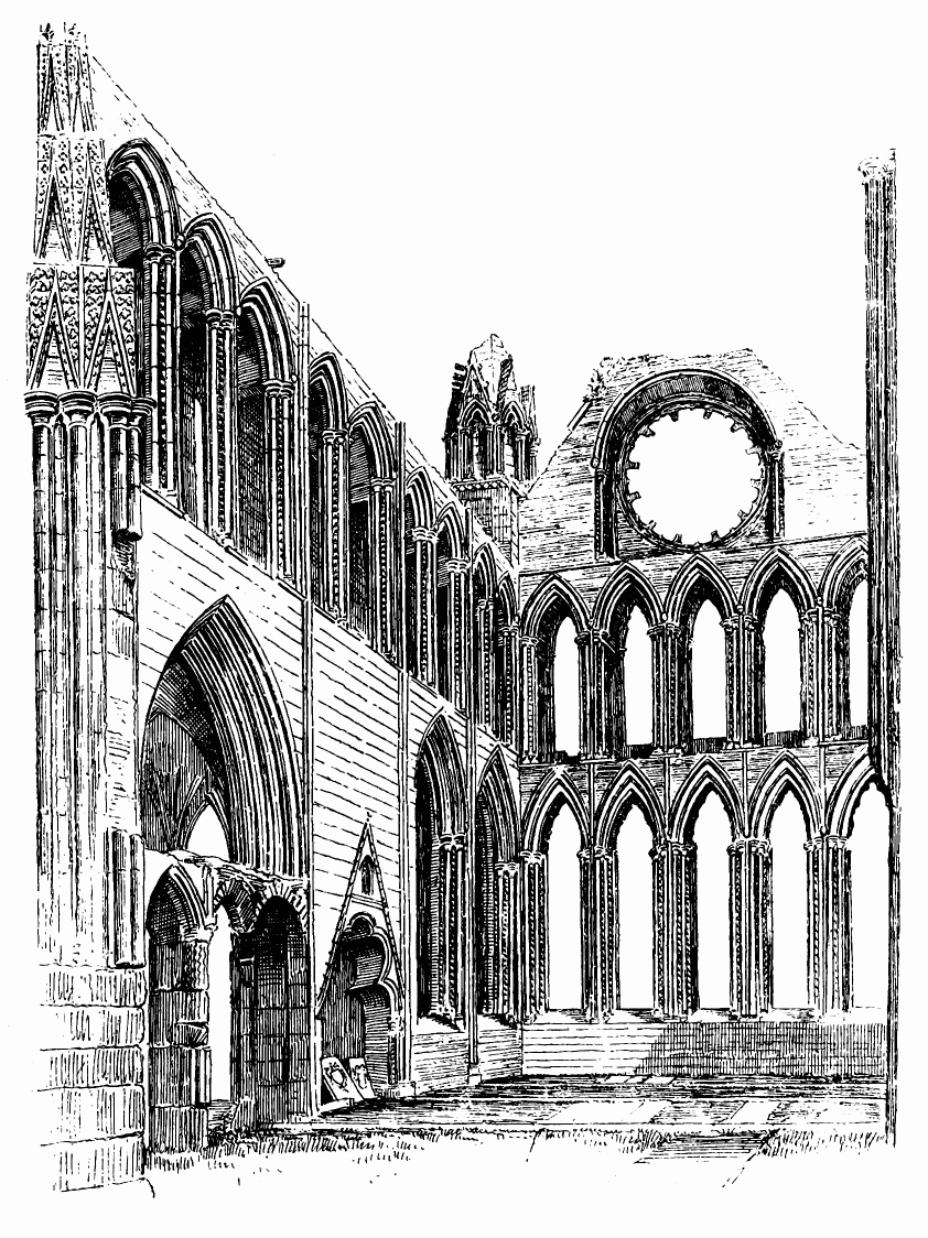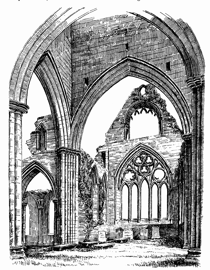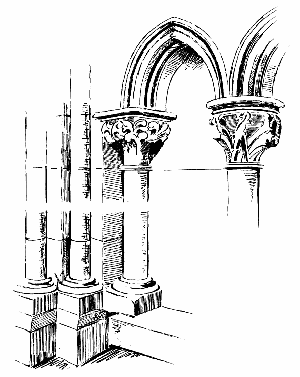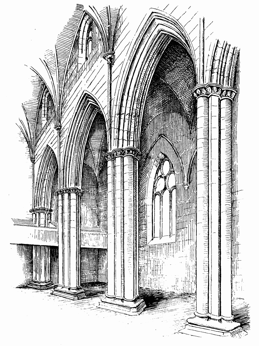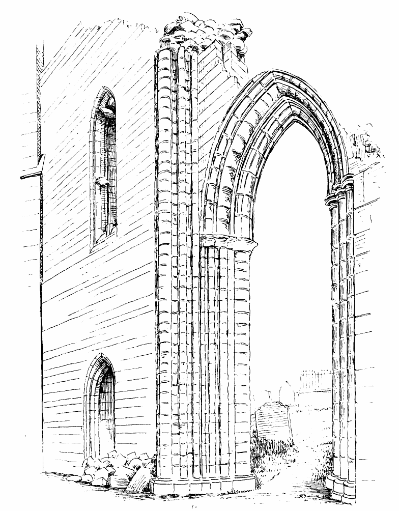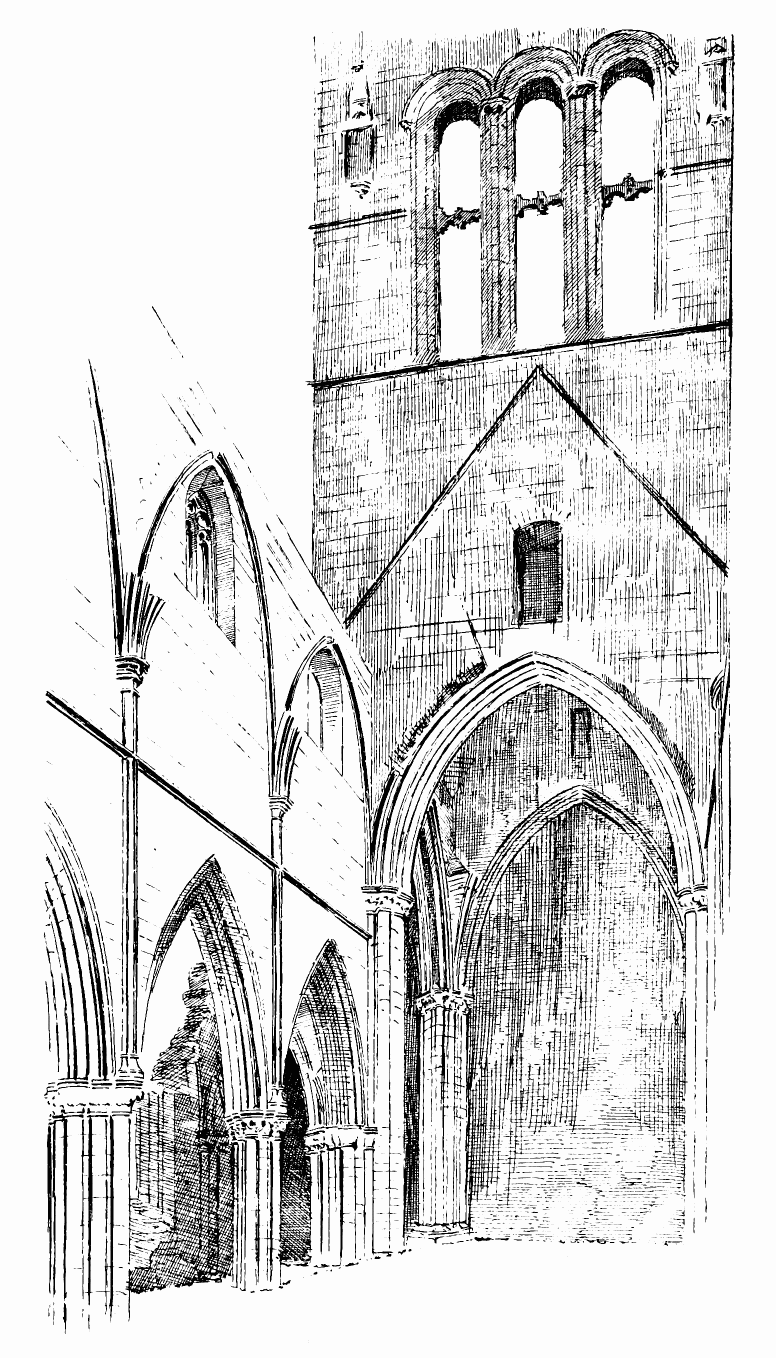 In Elgin Cathedral the vaulting shafts, which are mere{x} beads, descend to the ground, and the clerestory arcade is almost continuous.