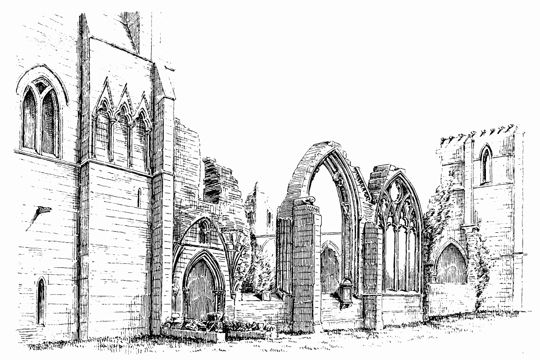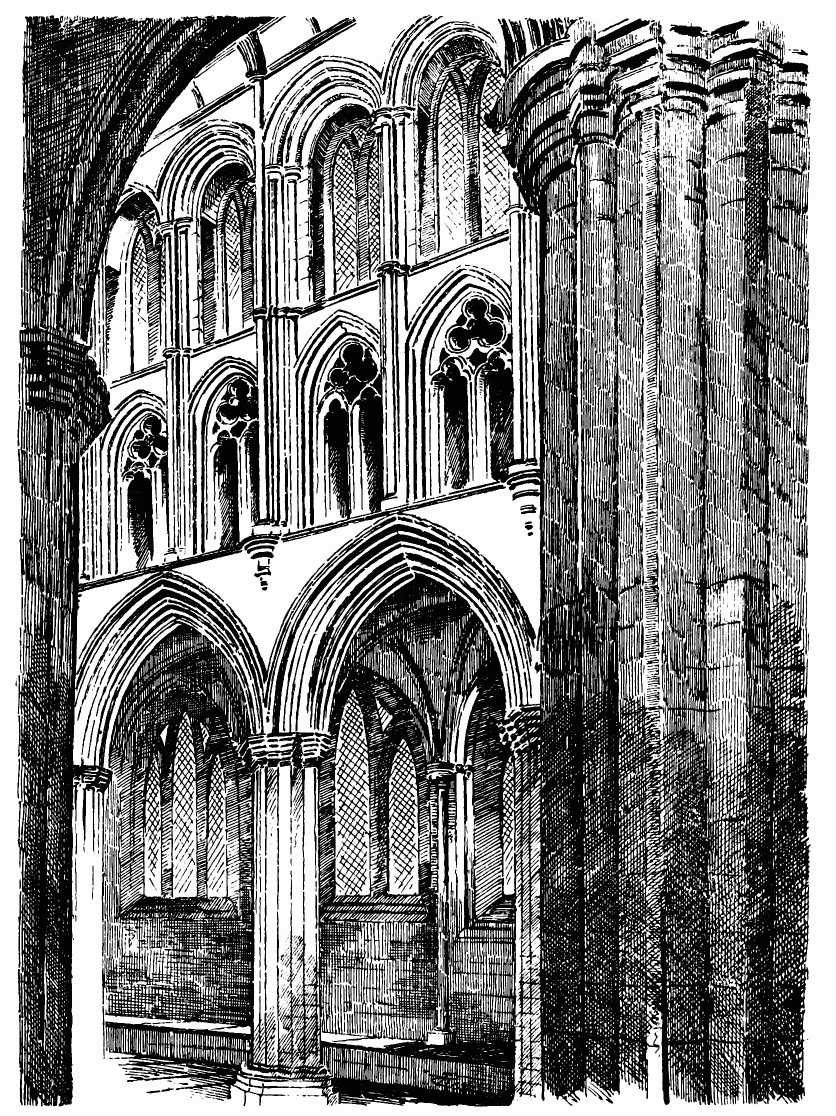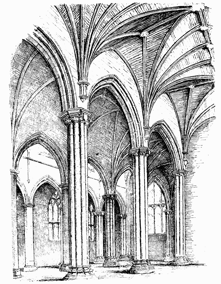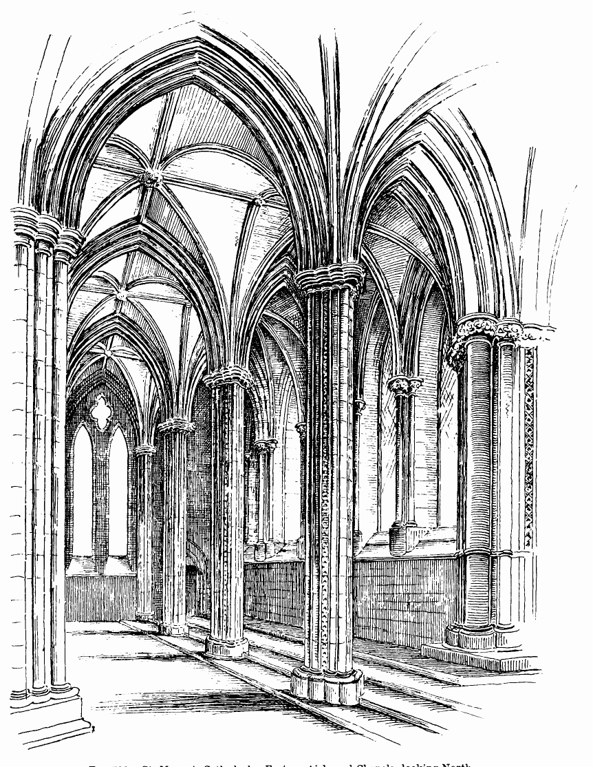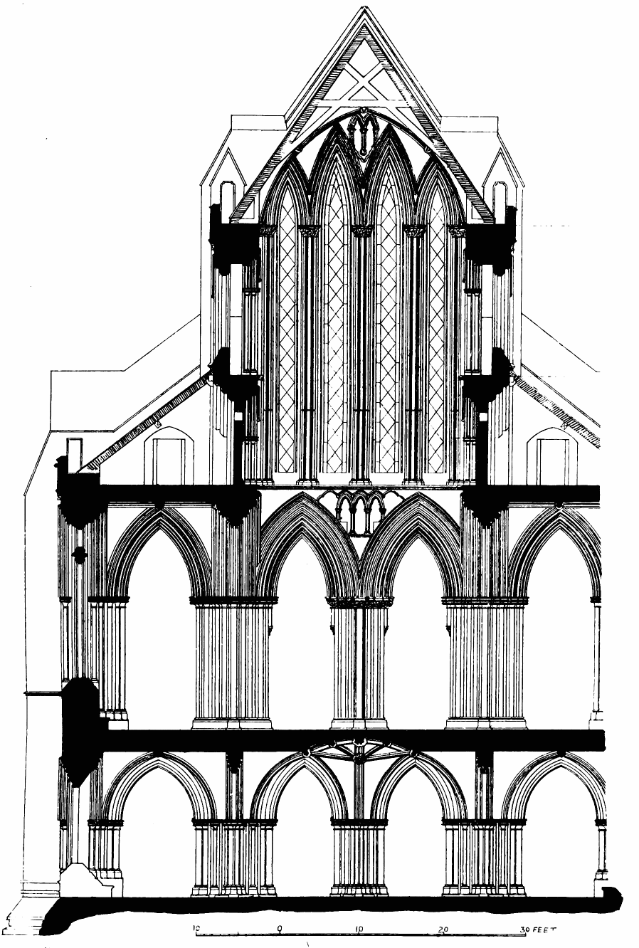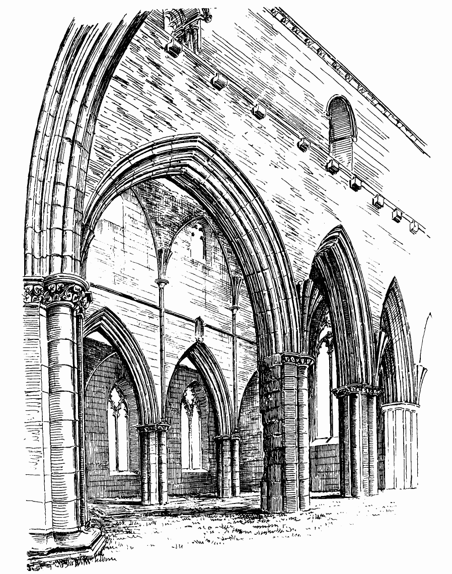 In Elgin Cathedral the vaulting shafts, which are mere{x} beads, descend to the ground, and the clerestory arcade is almost continuous.