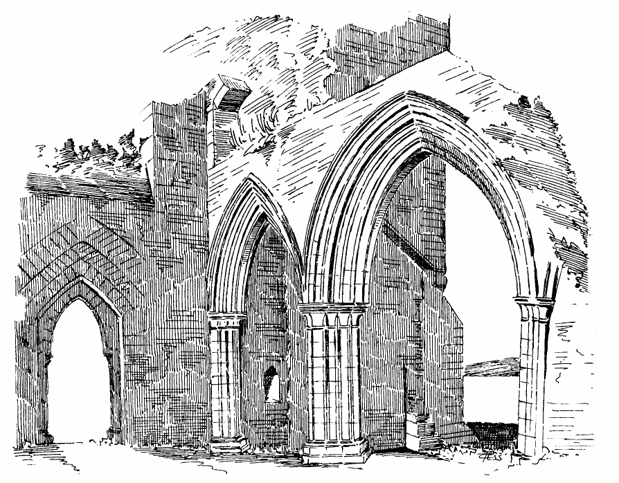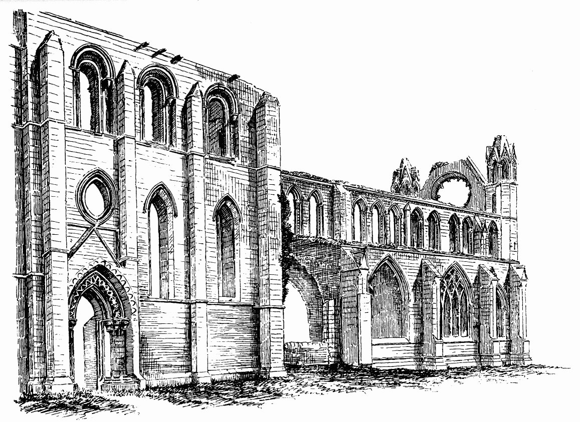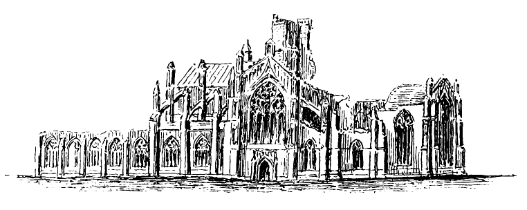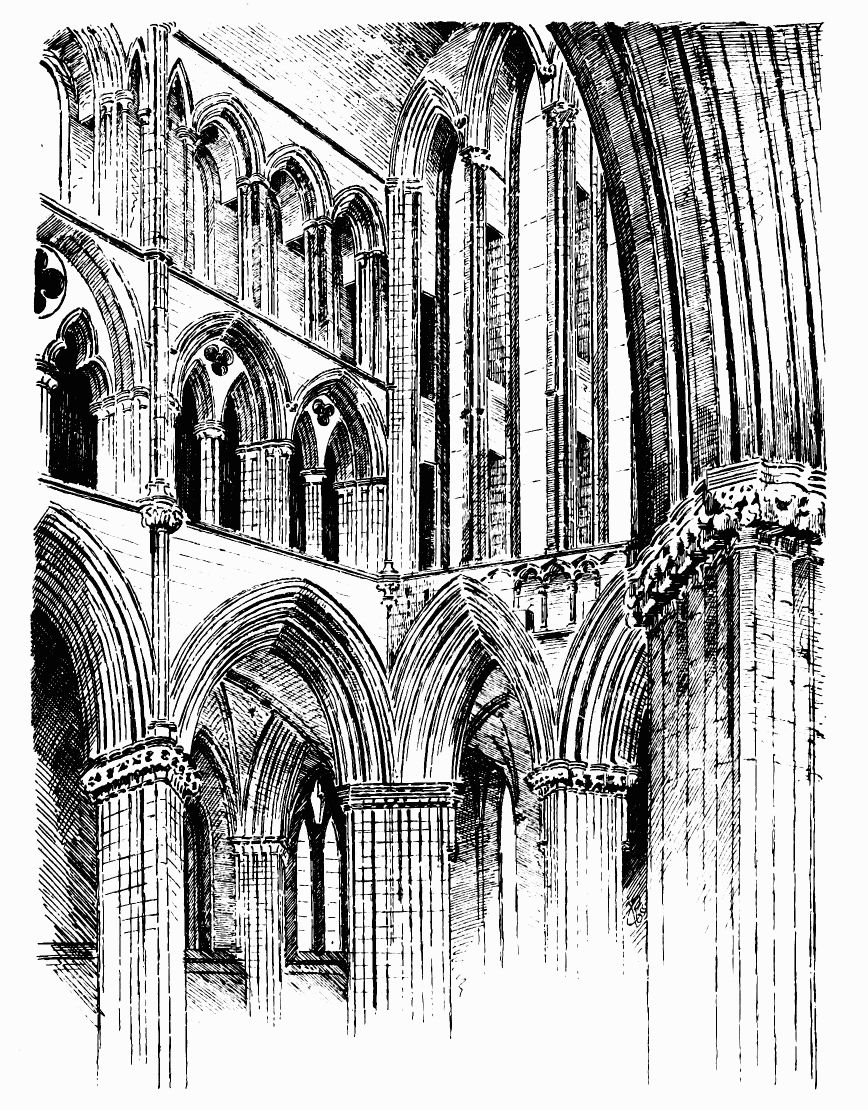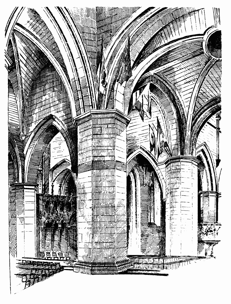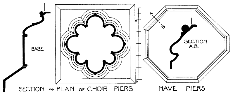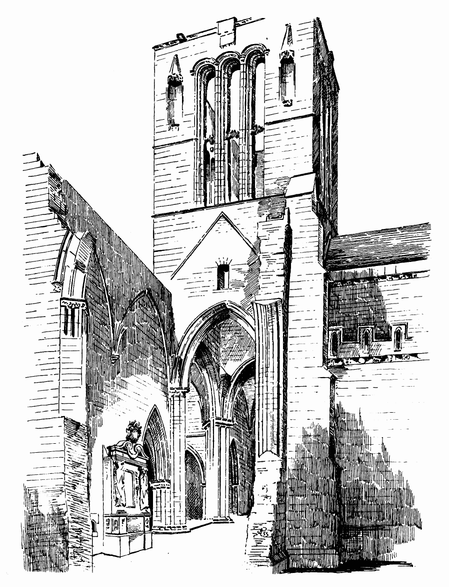 In Elgin Cathedral the vaulting shafts, which are mere{x} beads, descend to the ground, and the clerestory arcade is almost continuous.