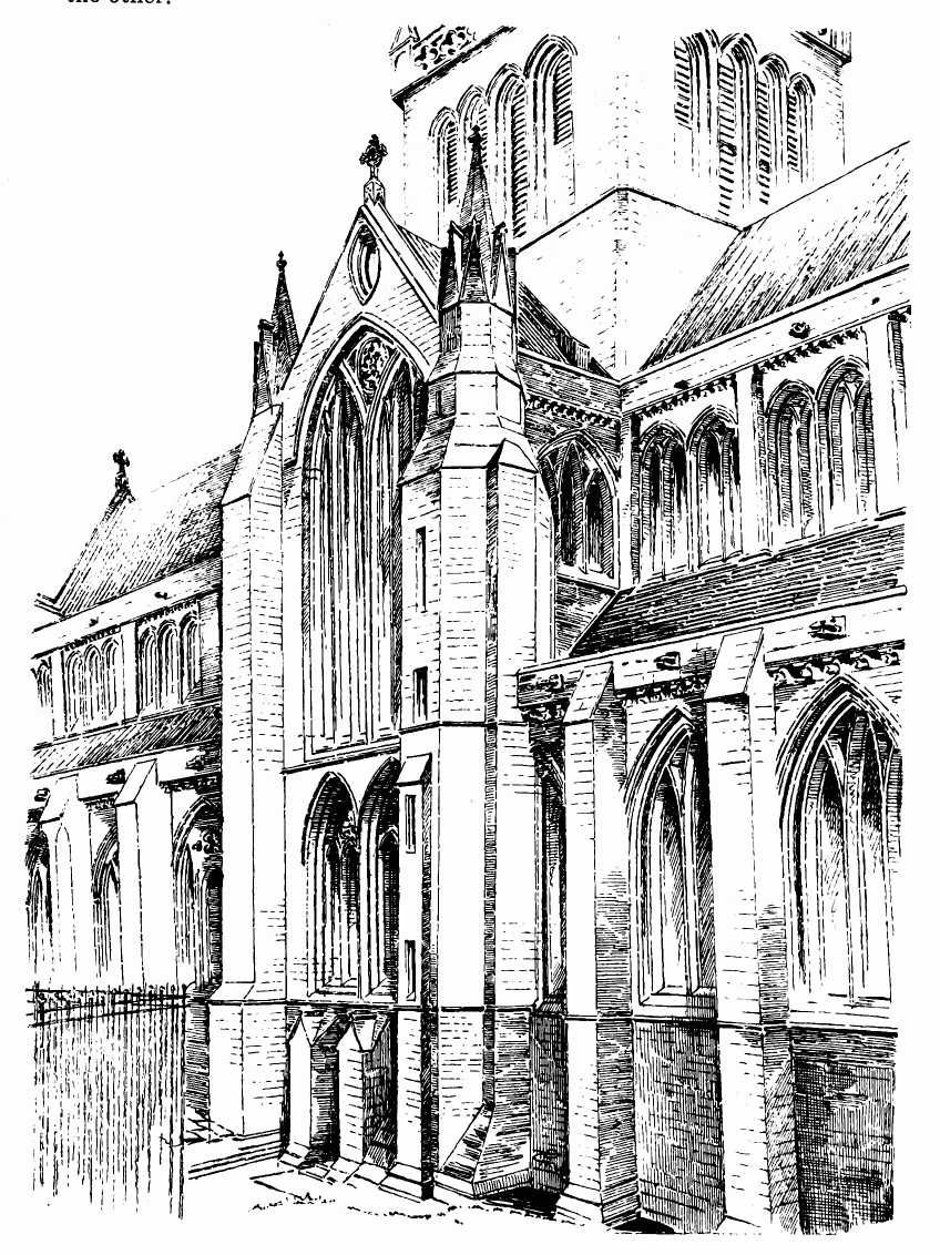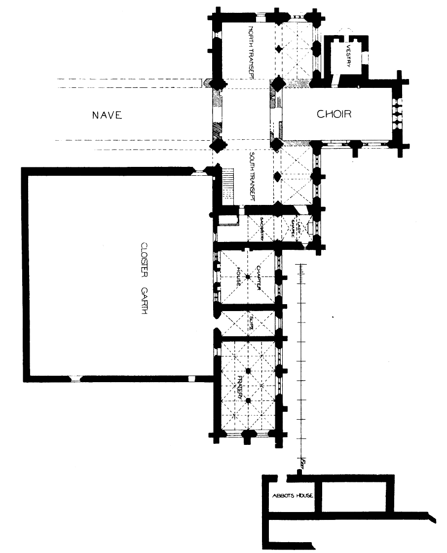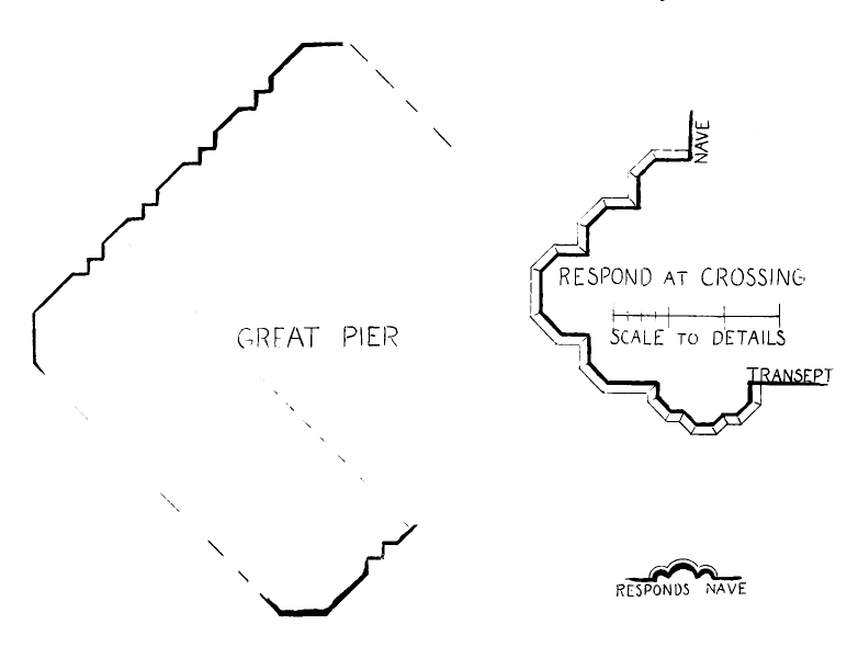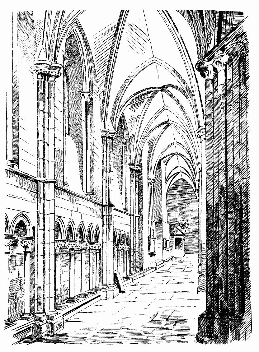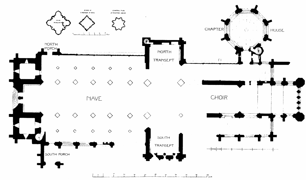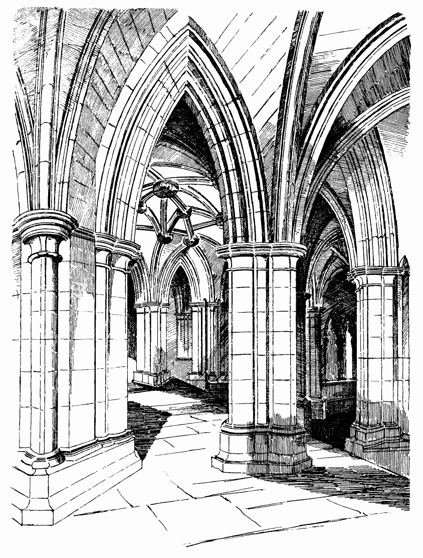 In Elgin Cathedral the vaulting shafts, which are mere{x} beads, descend to the ground, and the clerestory arcade is almost continuous.
