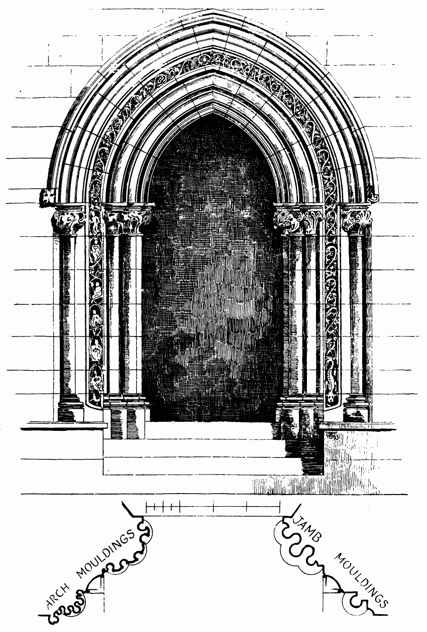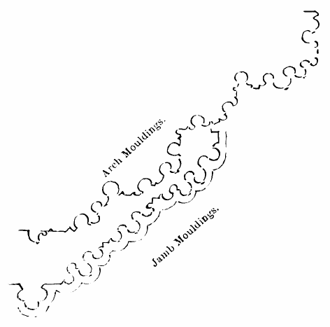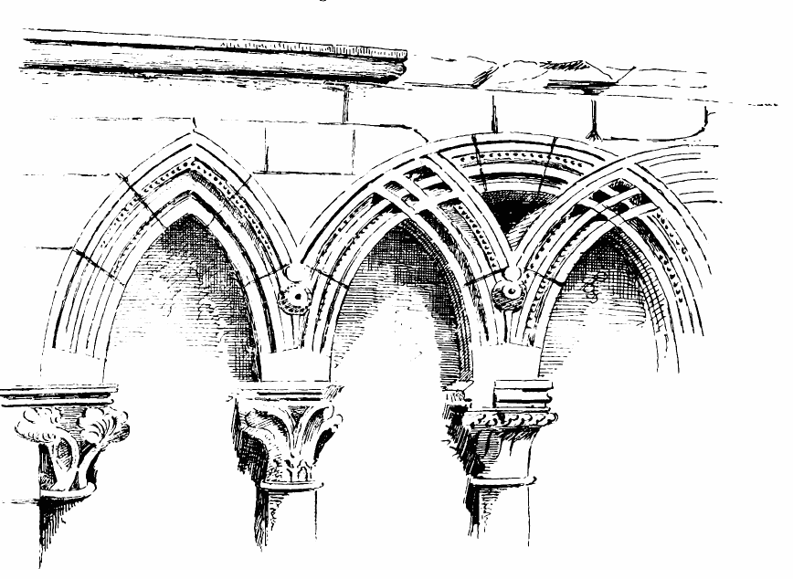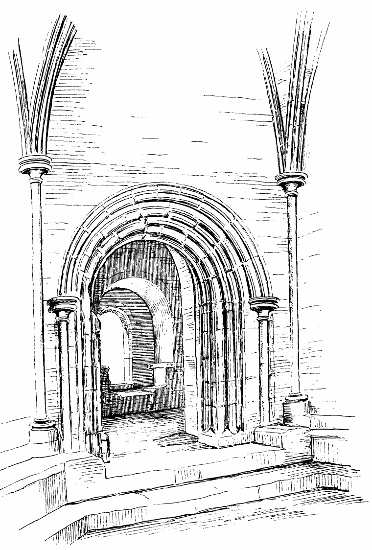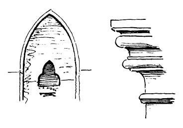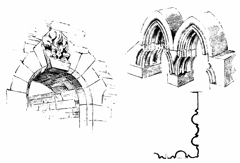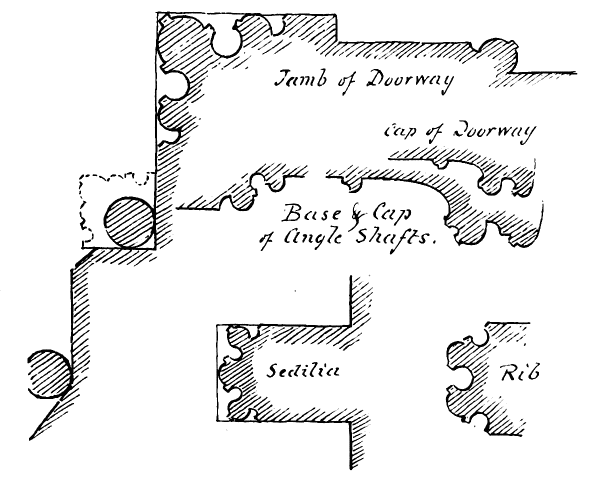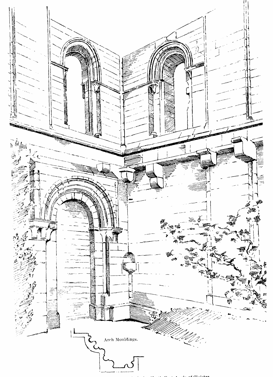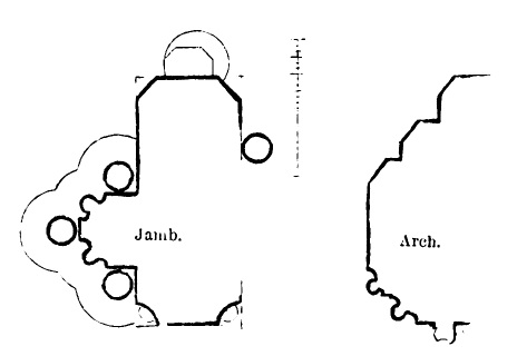 The west doorway from the cloister into the nave (which is in a modern vinery) has been opened up on the south side, and its massive first pointed architecture has been shown. The arch is pointed, and the details (including dog-tooth enrichments) correspond in style with the entrance to the chapter house (see Fig. 452).
