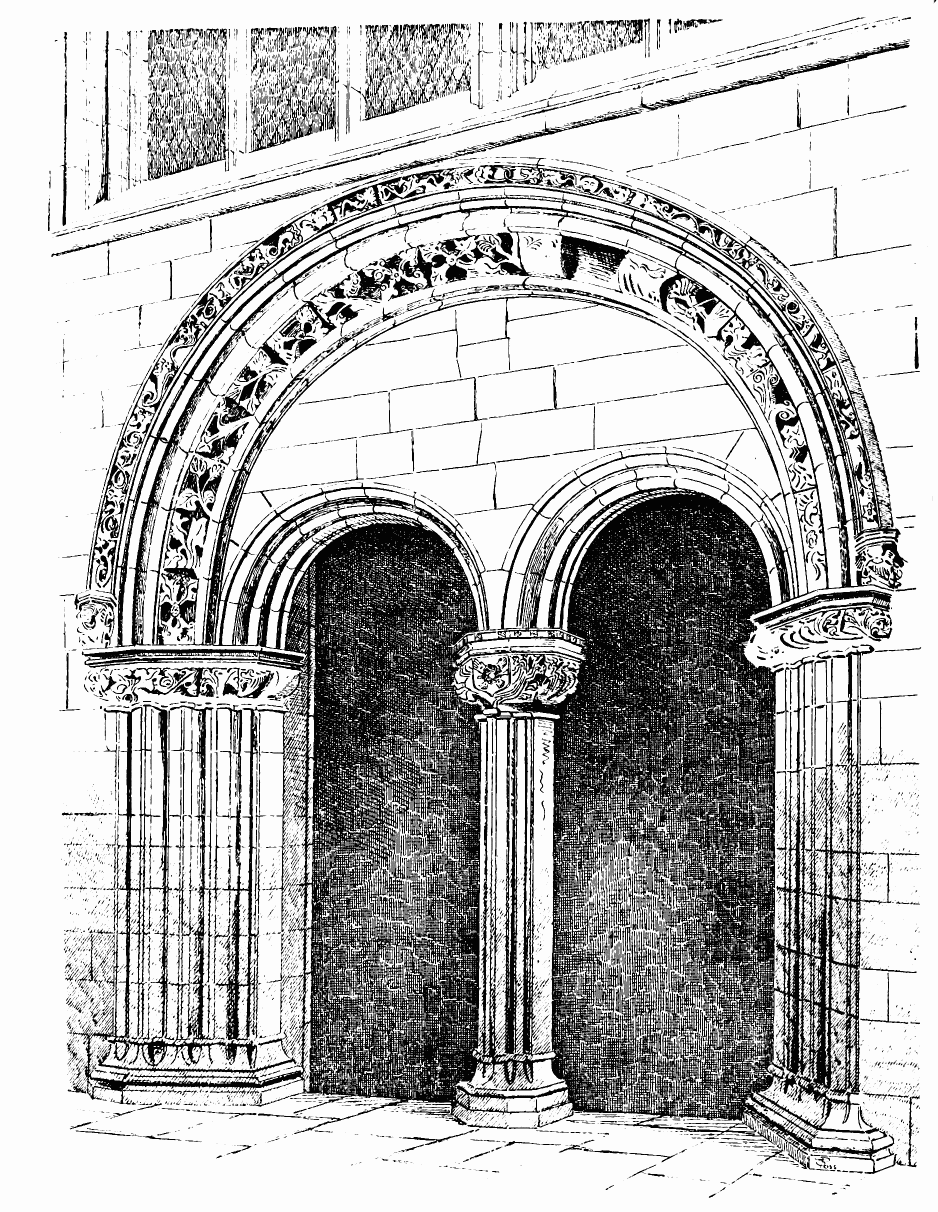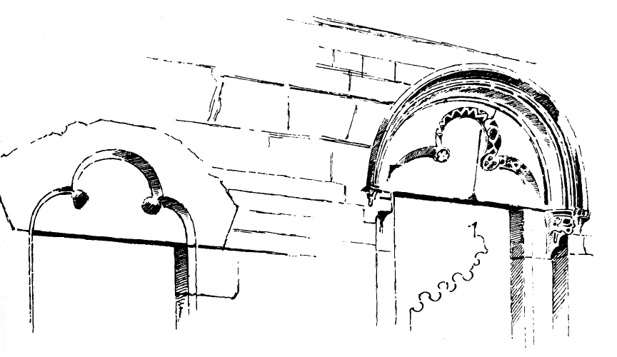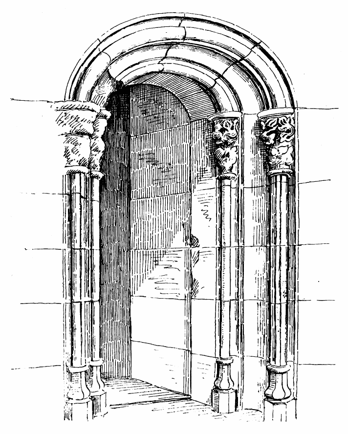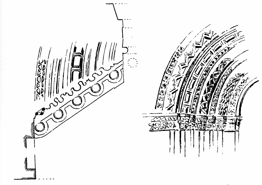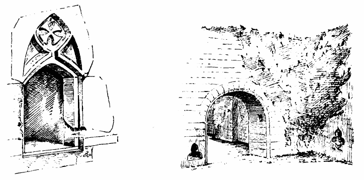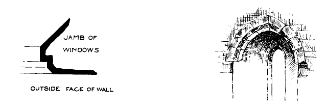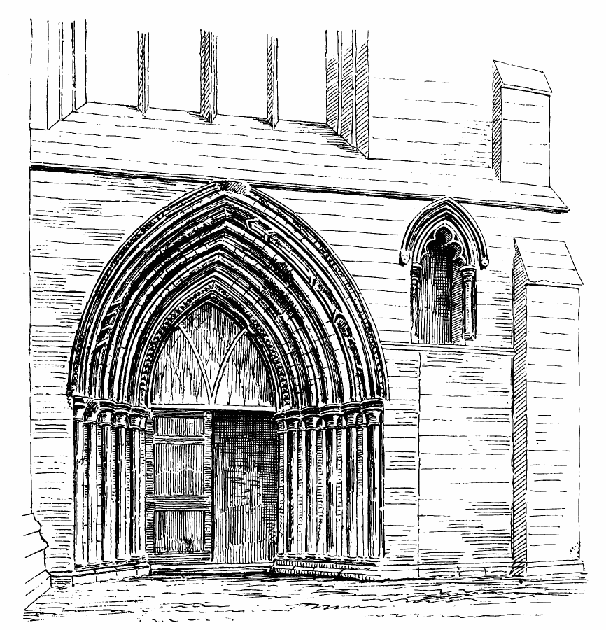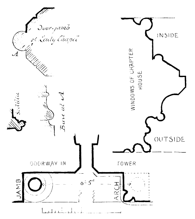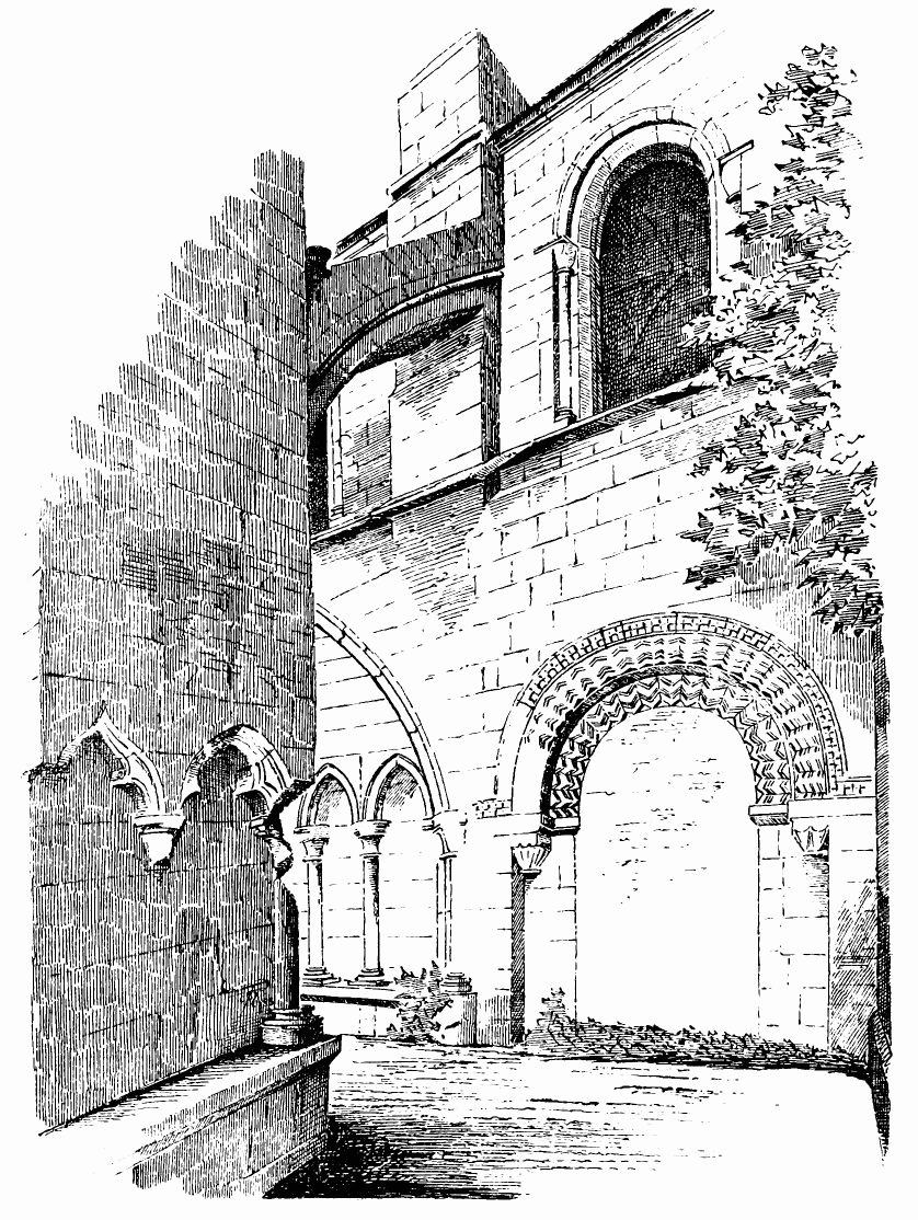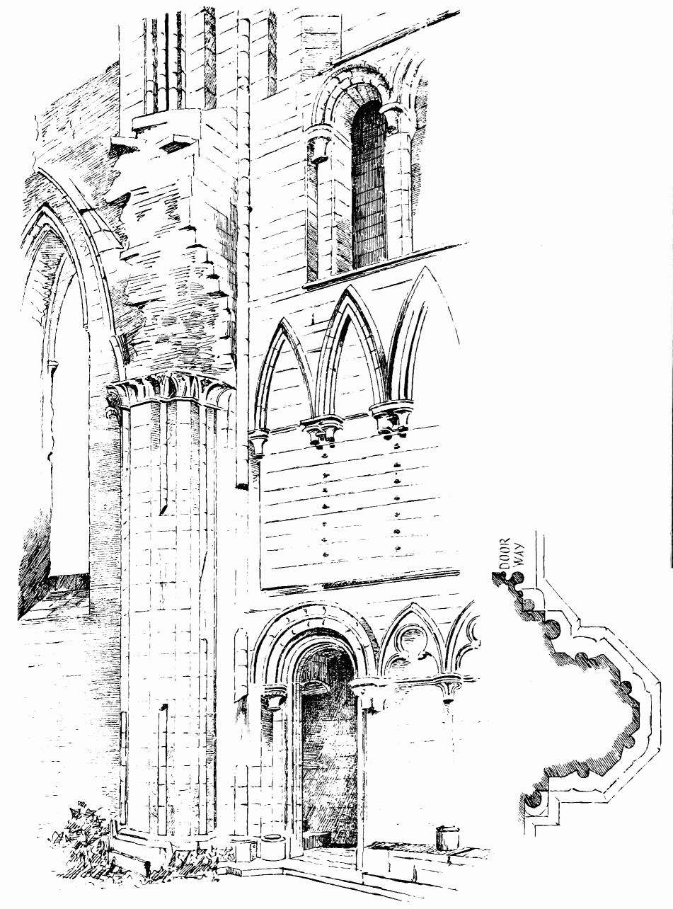 The west doorway from the cloister into the nave (which is in a modern vinery) has been opened up on the south side, and its massive first pointed architecture has been shown. The arch is pointed, and the details (including dog-tooth enrichments) correspond in style with the entrance to the chapter house (see Fig. 452).