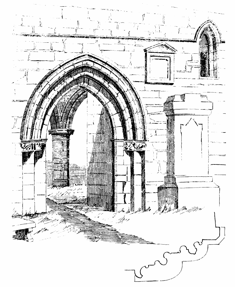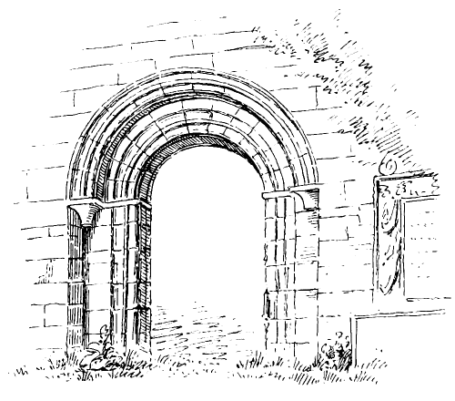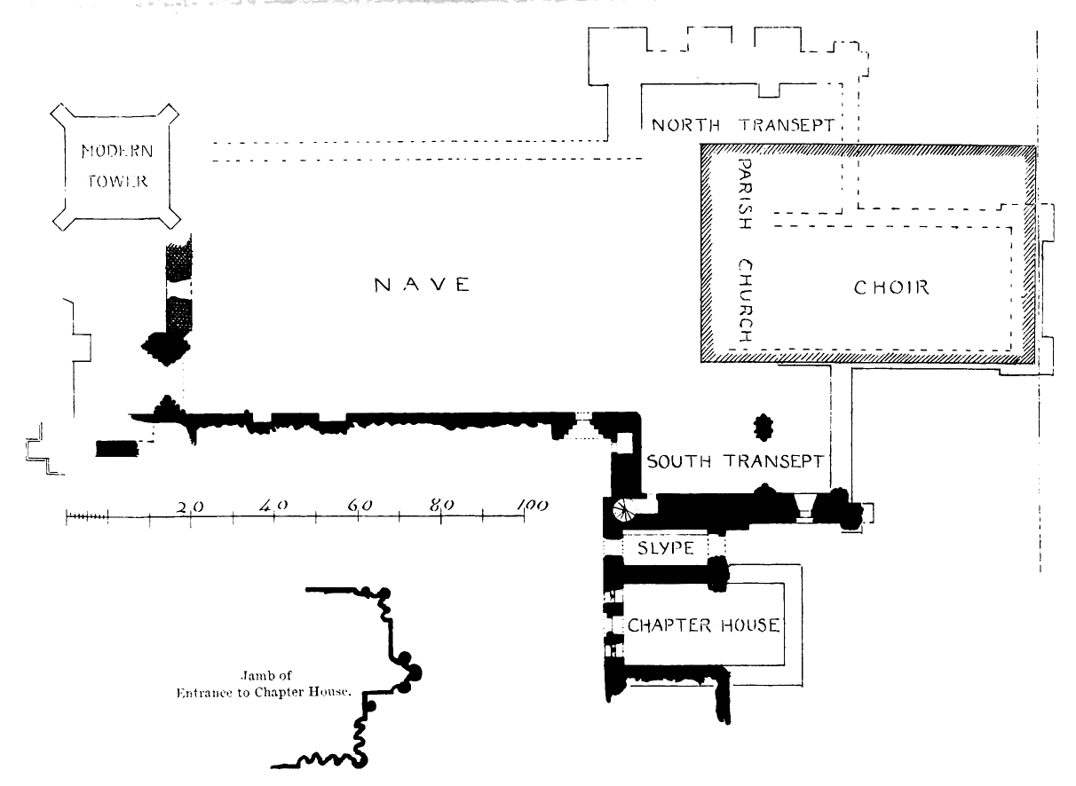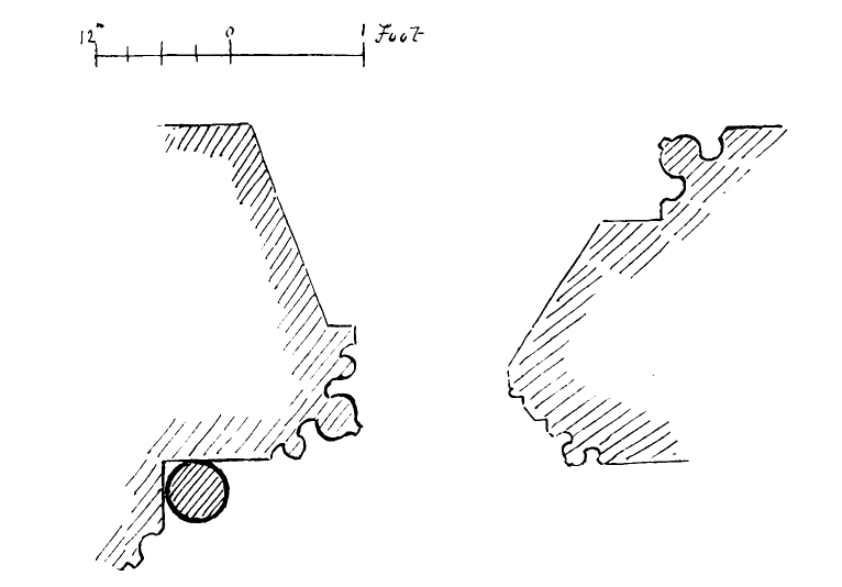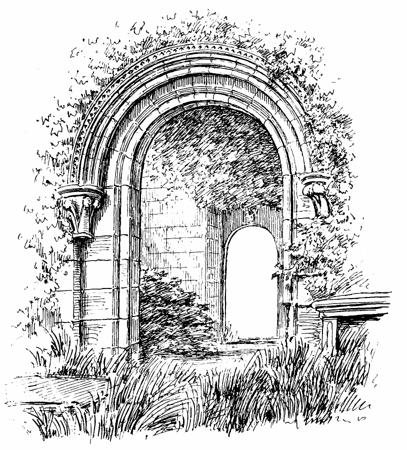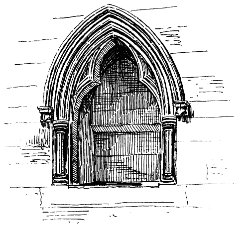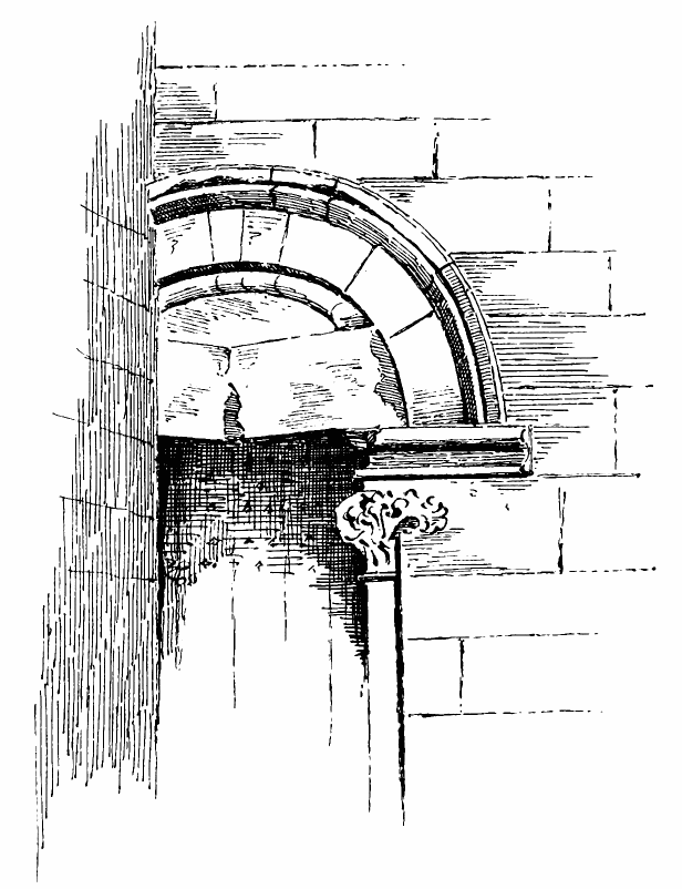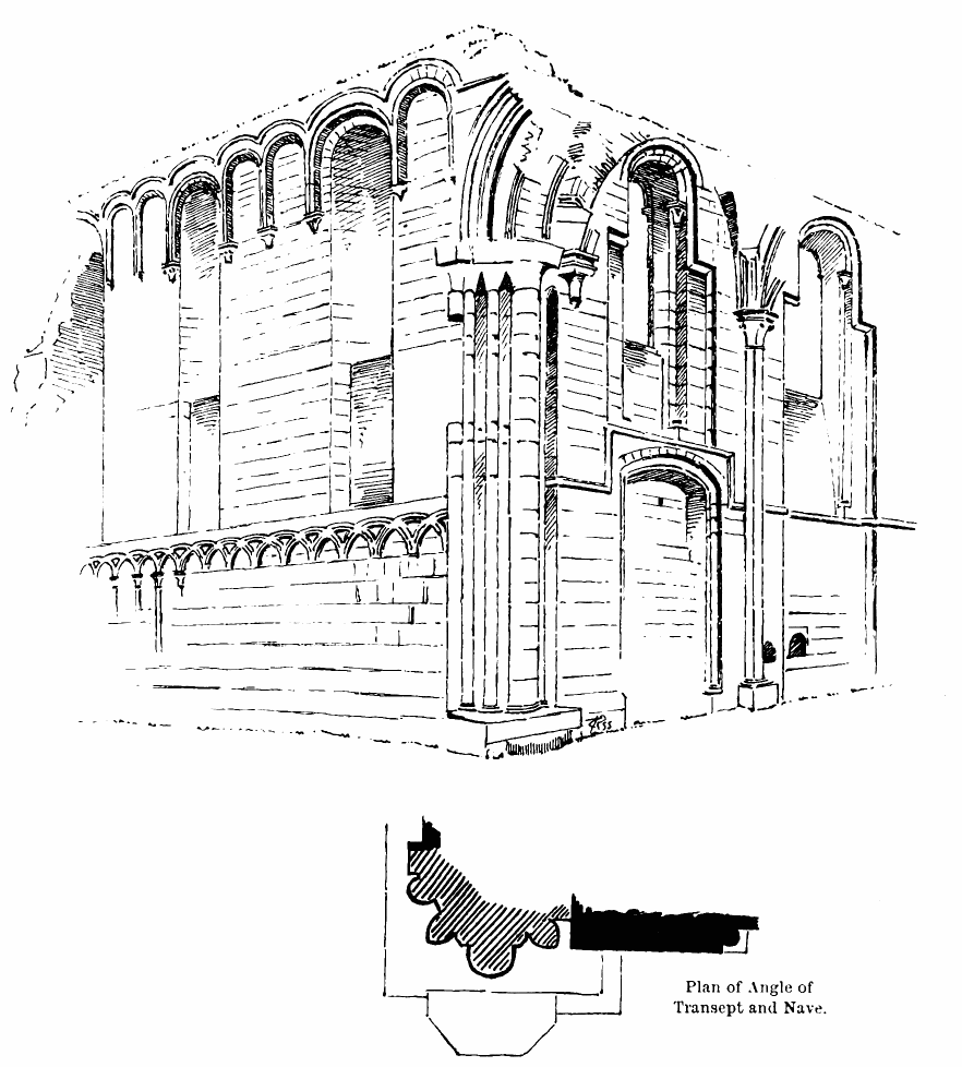 The west doorway from the cloister into the nave (which is in a modern vinery) has been opened up on the south side, and its massive first pointed architecture has been shown. The arch is pointed, and the details (including dog-tooth enrichments) correspond in style with the entrance to the chapter house (see Fig. 452).