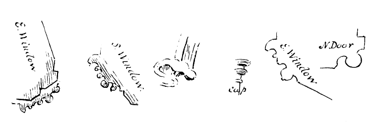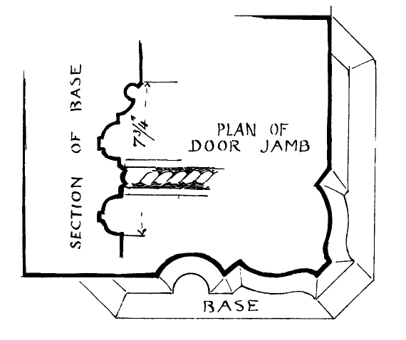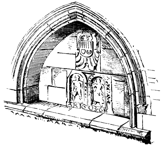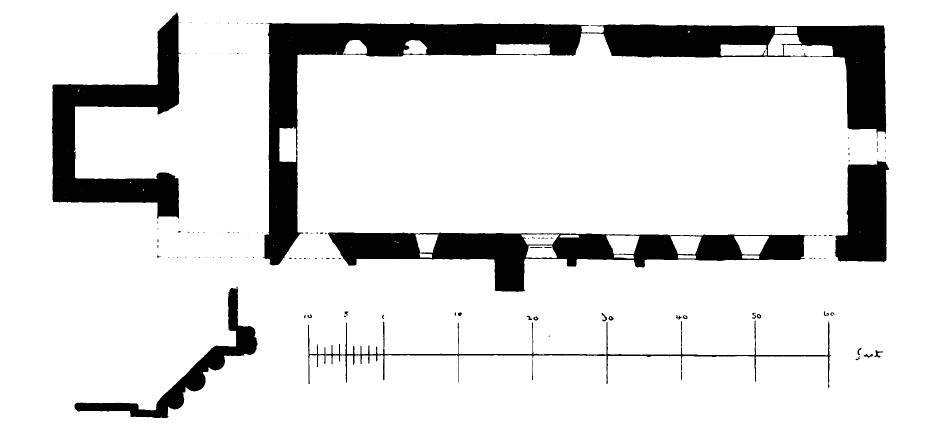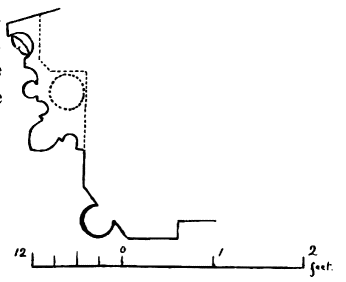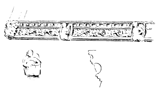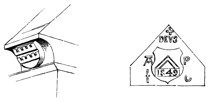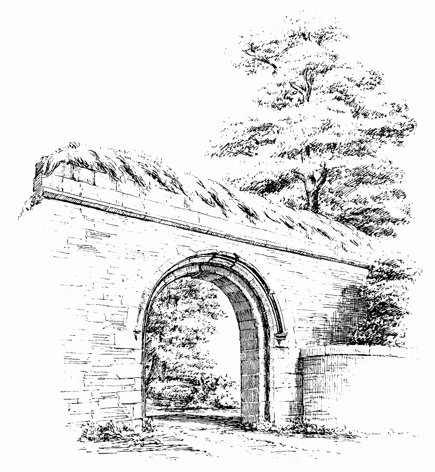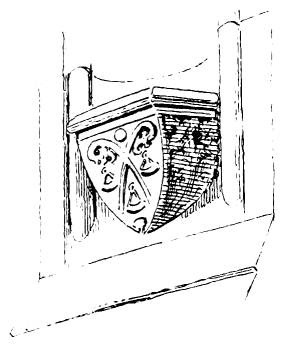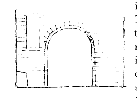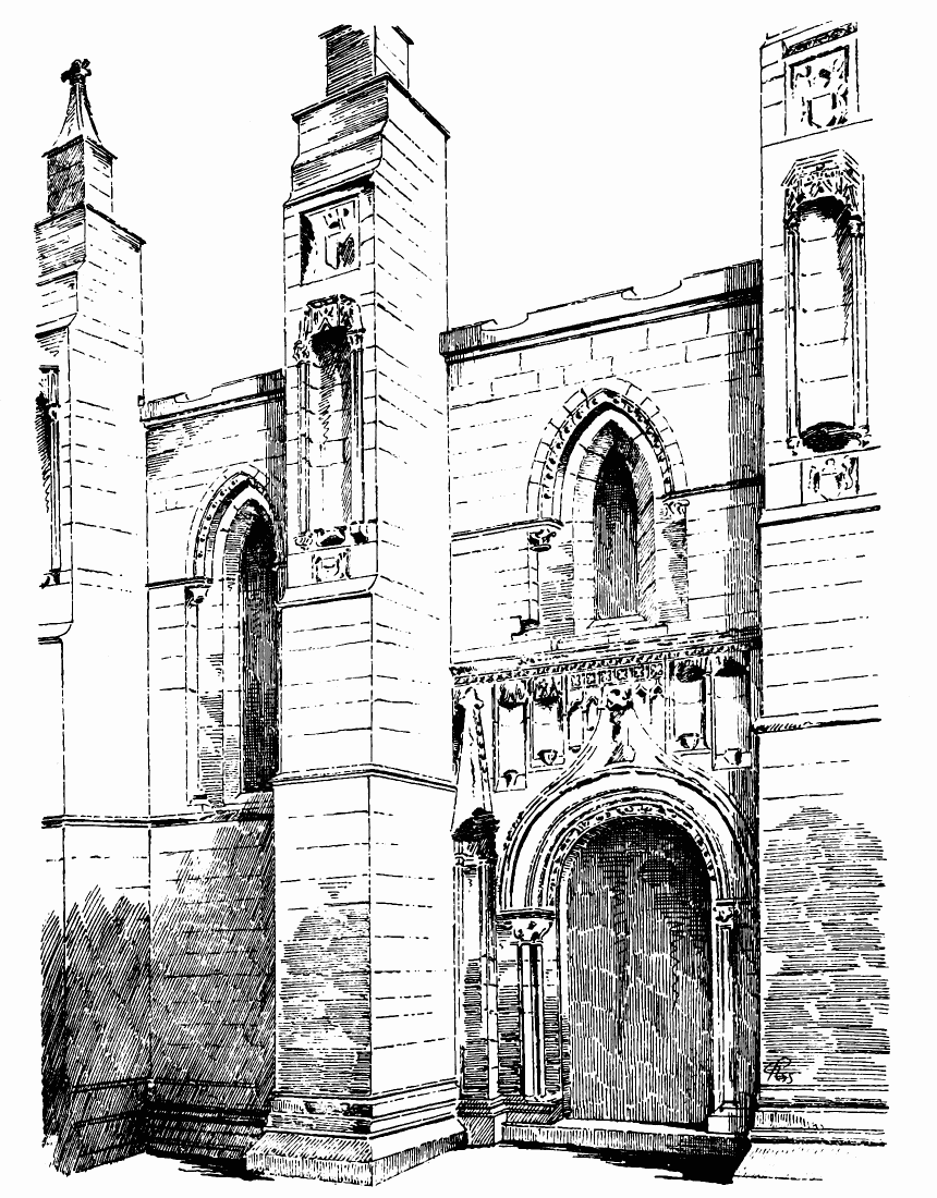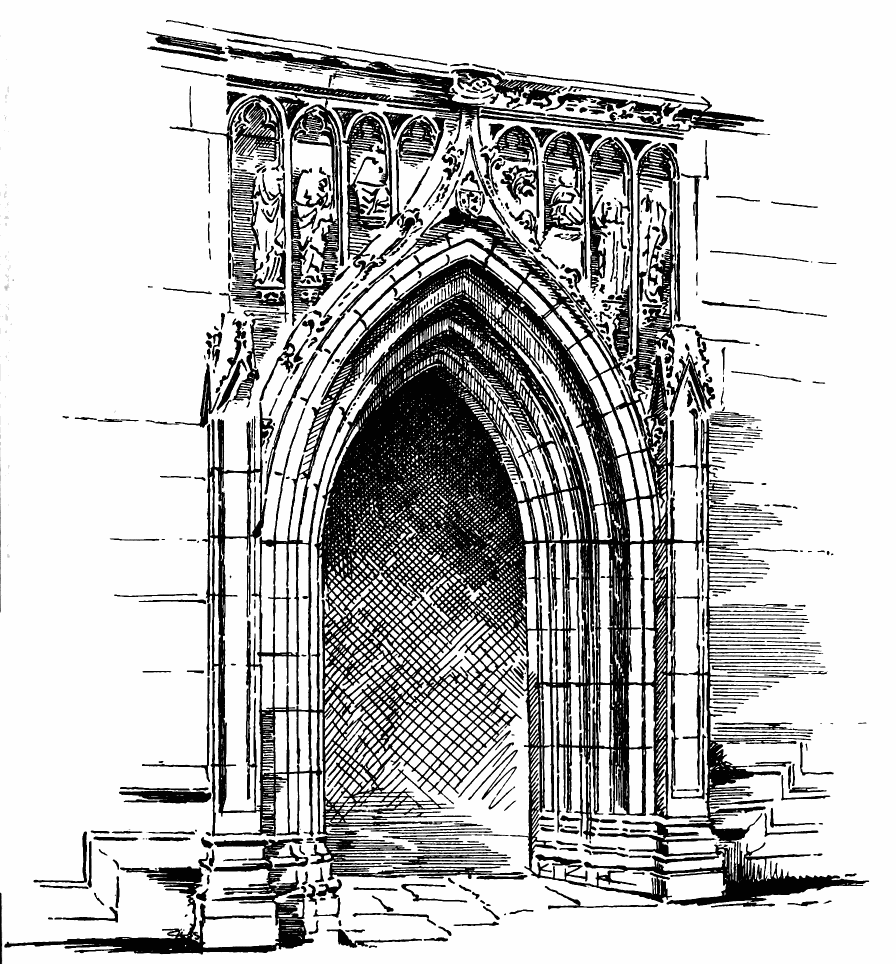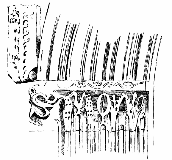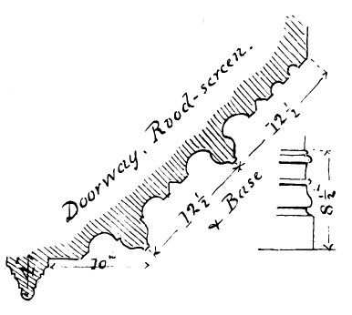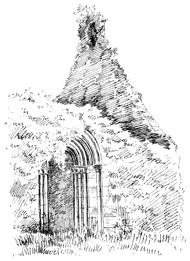The west doorway from the cloister into the nave (which is in a modern vinery) has been opened up on the south side, and its massive first pointed architecture has been shown. The arch is pointed, and the details (including dog-tooth enrichments) correspond in style with the entrance to the chapter house (see Fig. 452).