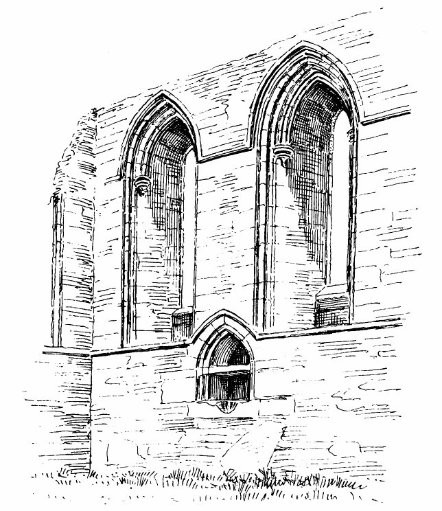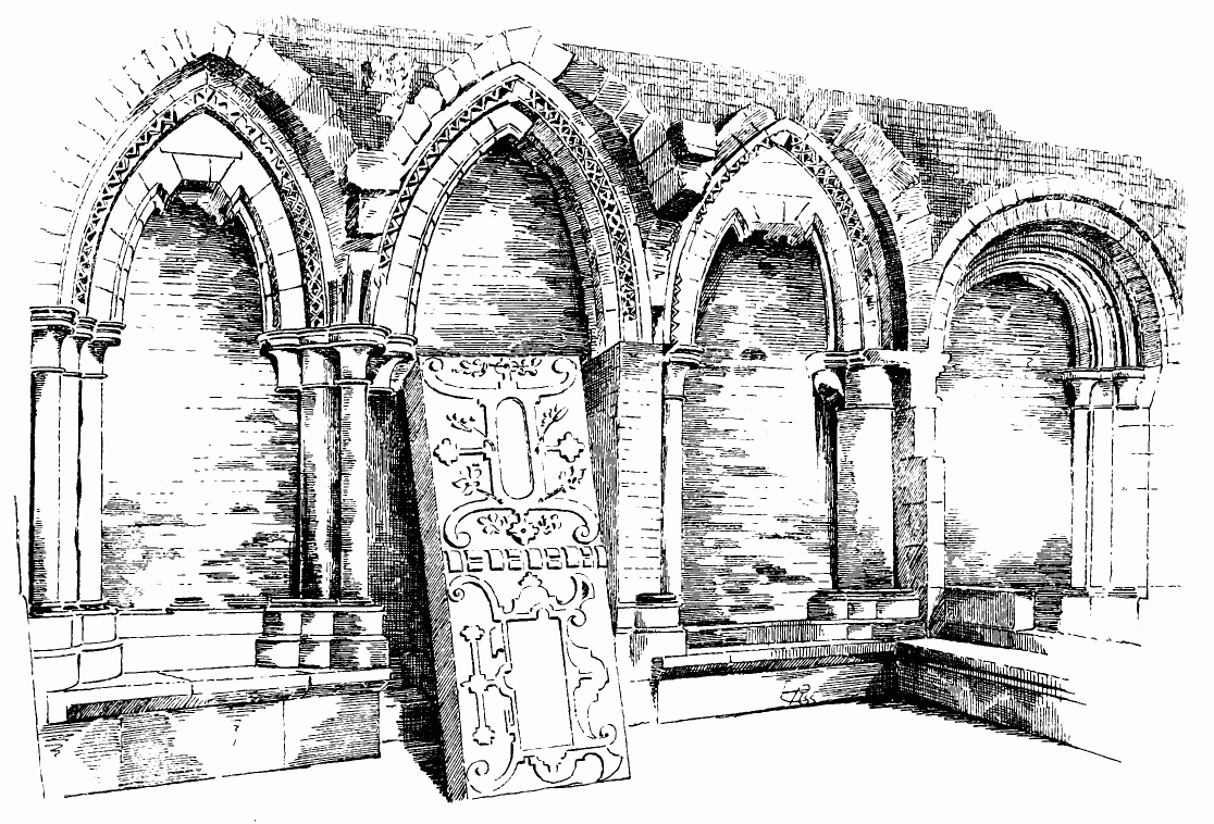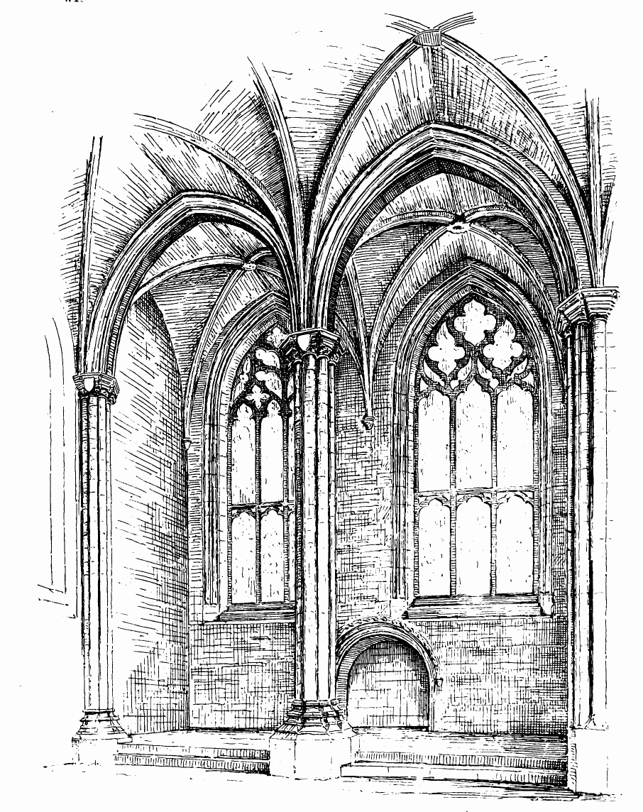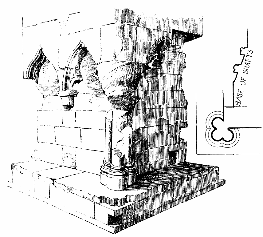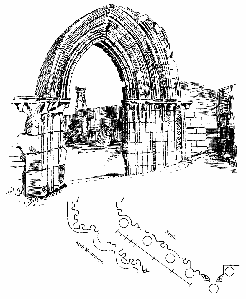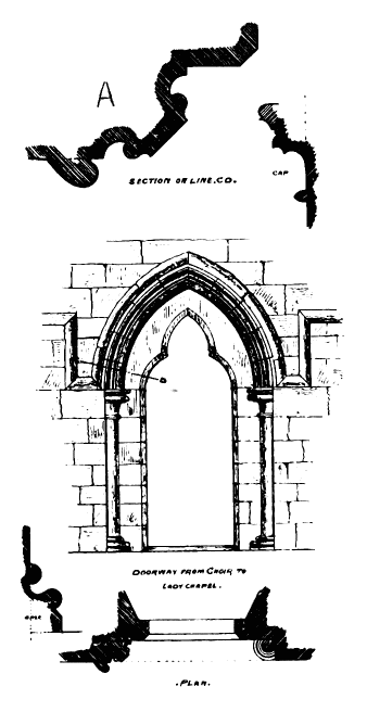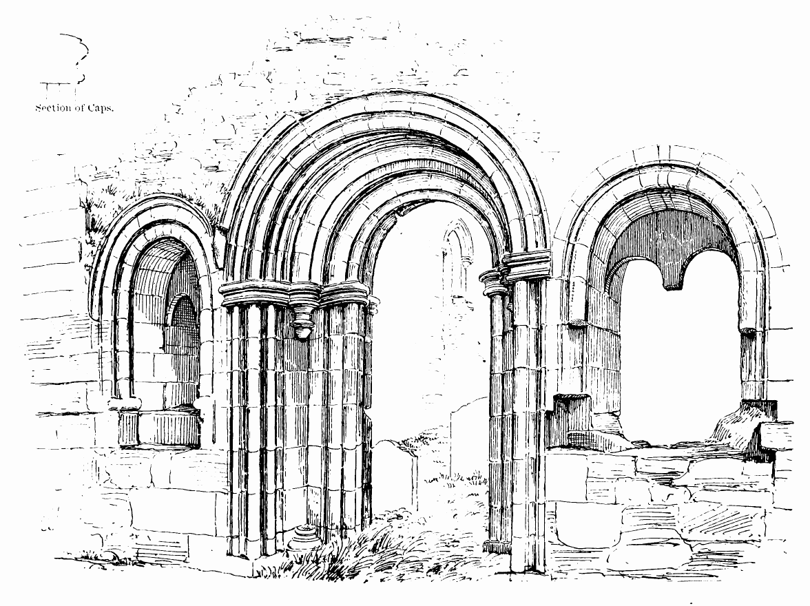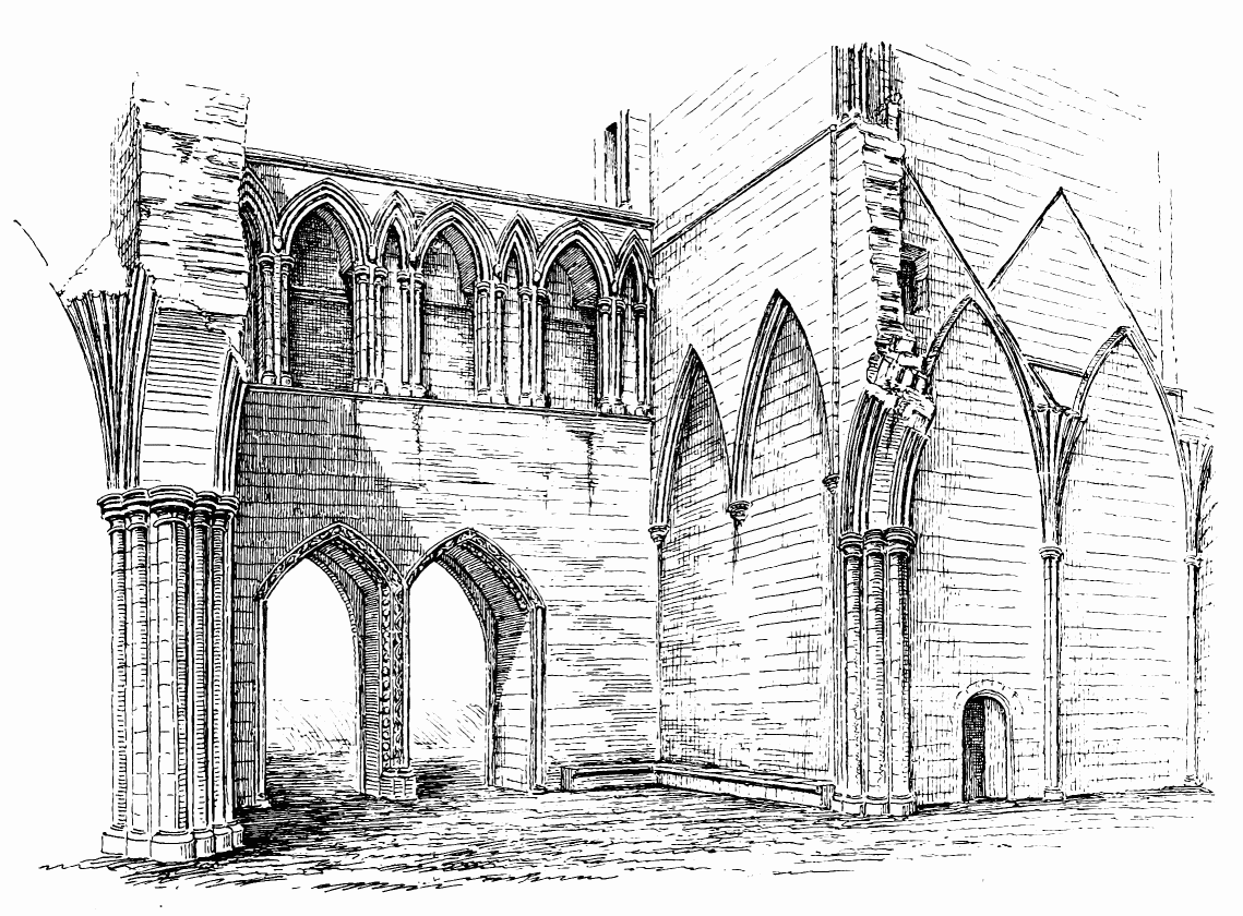 “He [Halderston] built the eastern gable from the foundations, along with its arch [arcuali voltâ].” As Lord Bute remarks—“This must mean only the east window, the greater part of the east wall being of transition work” (see Figs. 443-444.) “He adorned pleasingly the hinder vestry [revestiarium] with the reliques and other restorations and cases [clausaris] at considerable expense.”