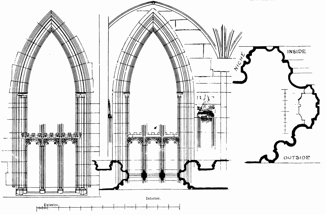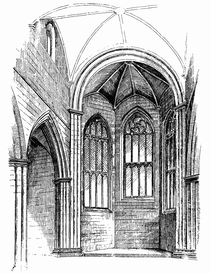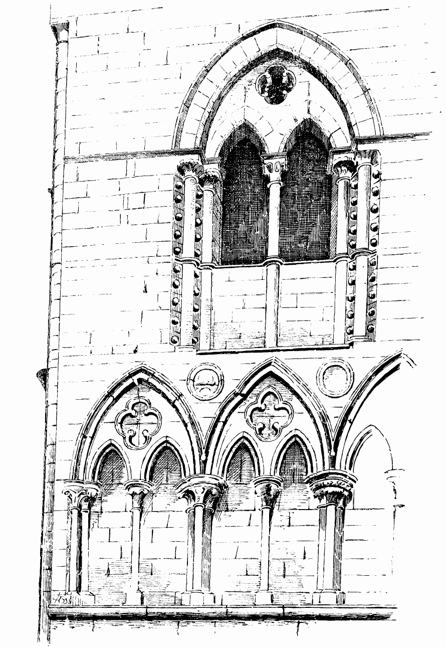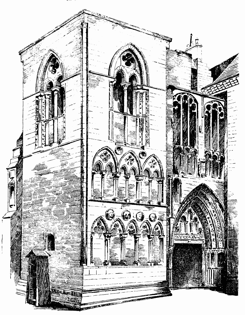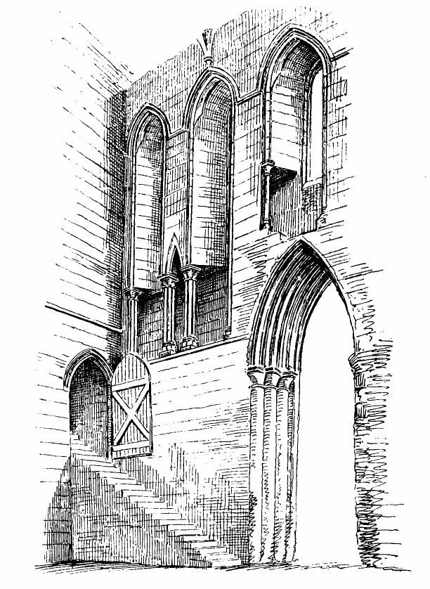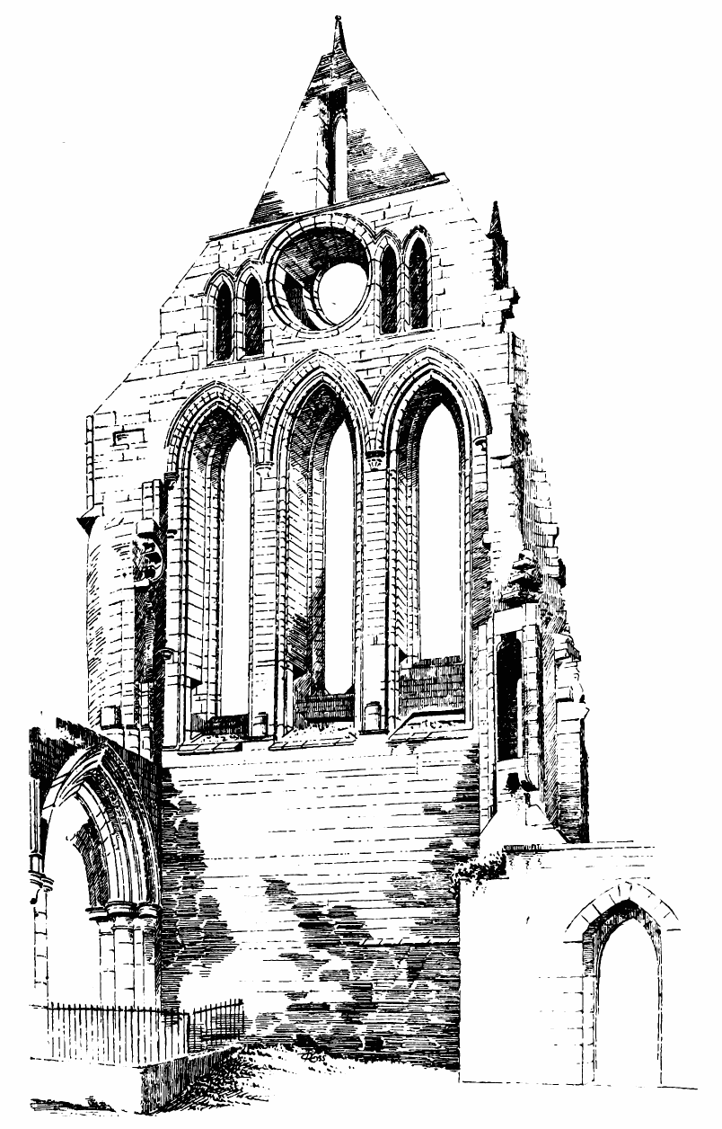 “He [Halderston] built the eastern gable from the foundations, along with its arch [arcuali voltâ].” As Lord Bute remarks—“This must mean only the east window, the greater part of the east wall being of transition work” (see Figs. 443-444.) “He adorned pleasingly the hinder vestry [revestiarium] with the reliques and other restorations and cases [clausaris] at considerable expense.”